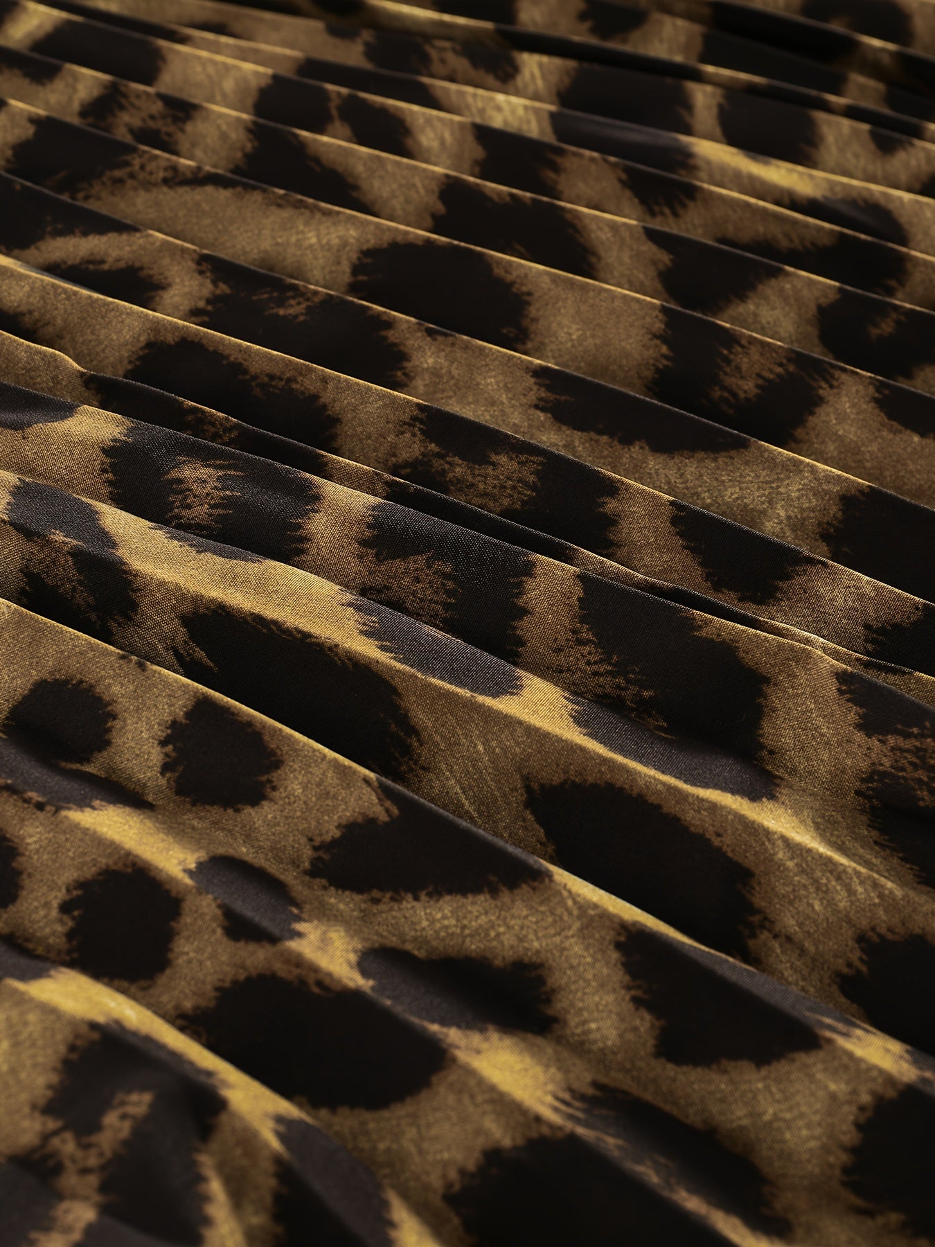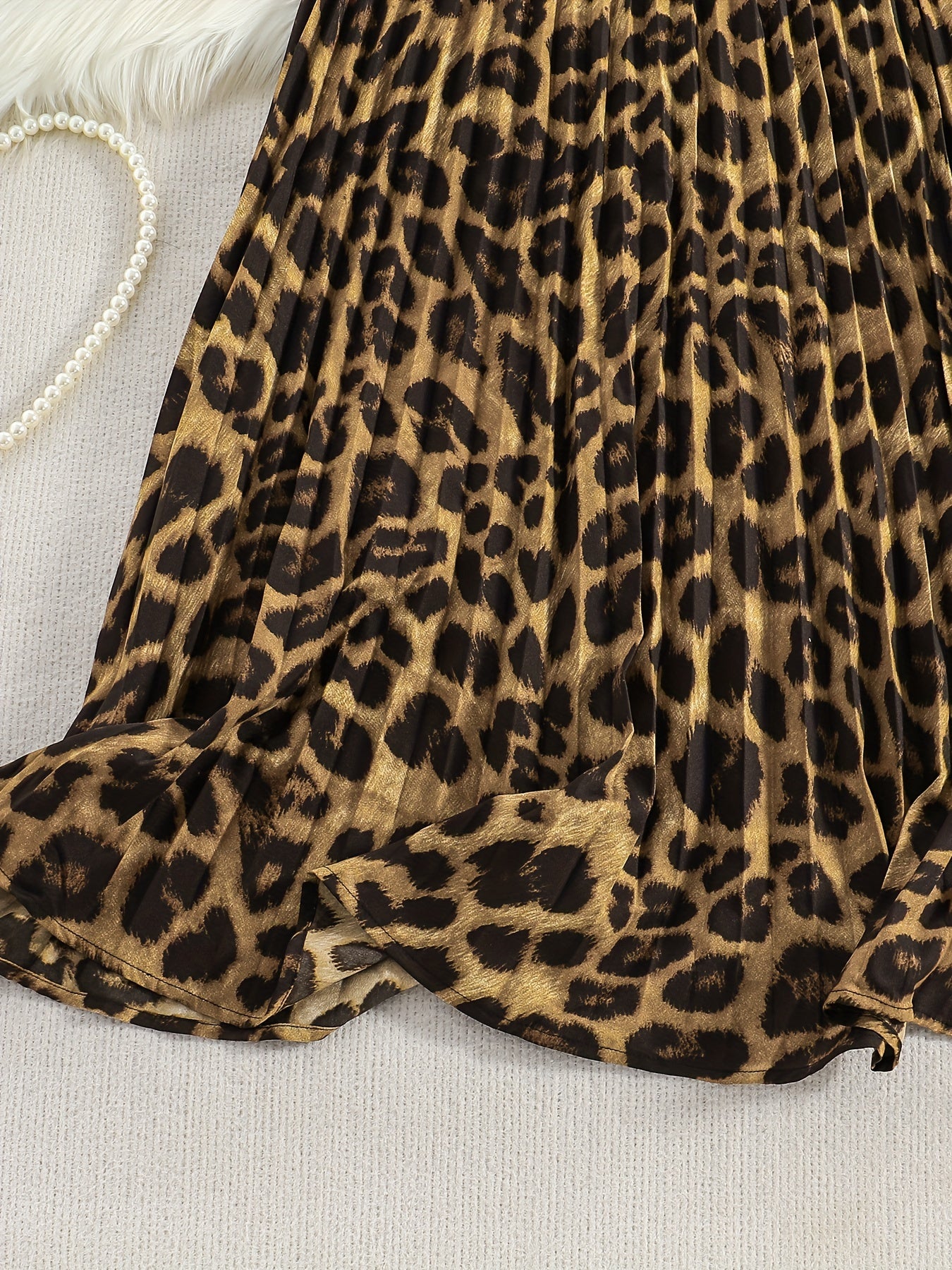 Women's Leopard Print Pleated Midi Skirt Polyester Flared Hem All Seasons