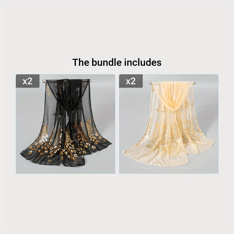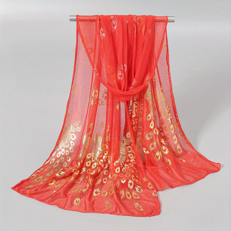 Women’s Peacock Print Lightweight Sun-Protective Polyester Scarf with Shimmering Foil