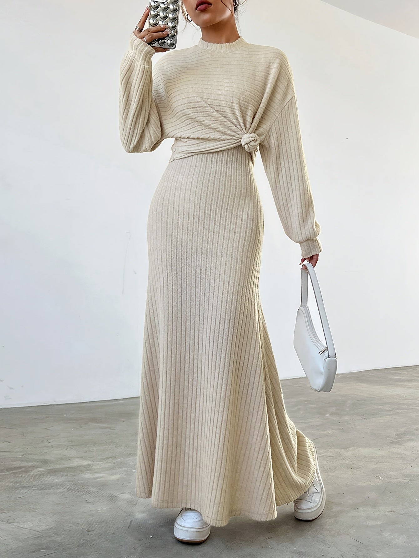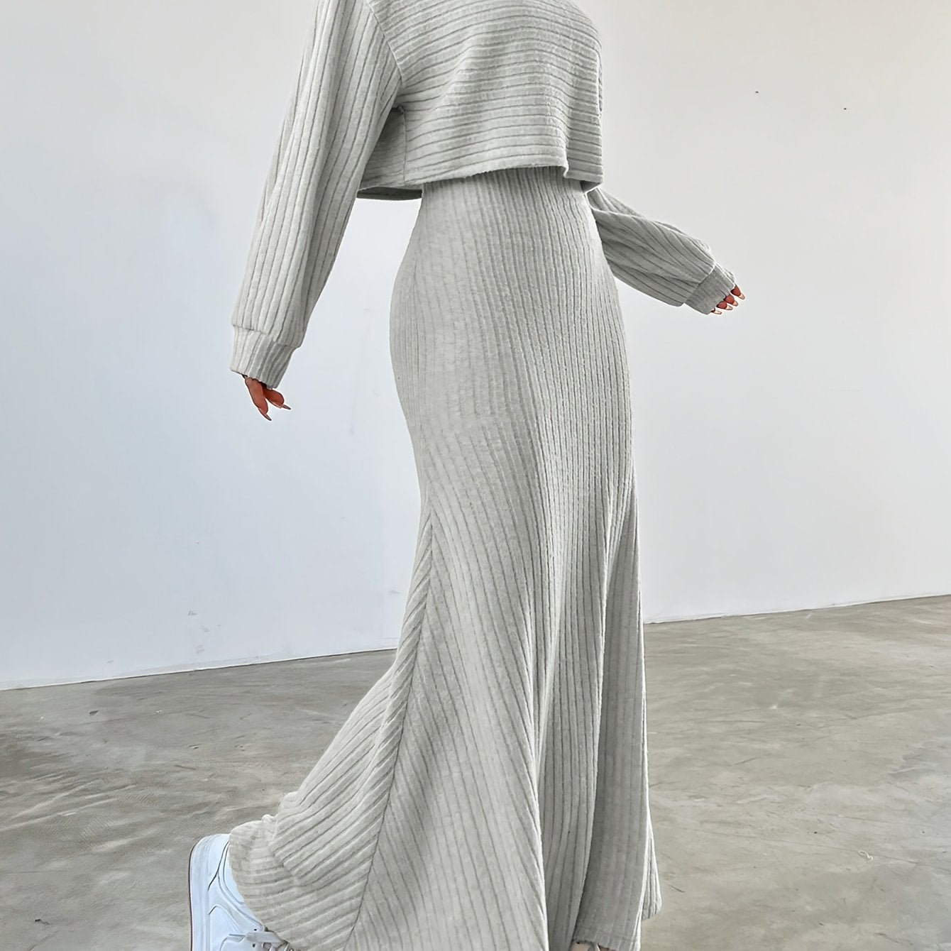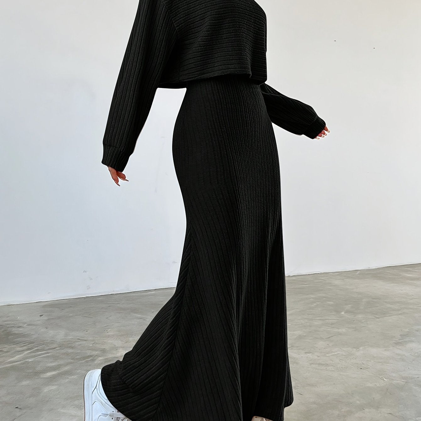 Women's Ribbed Knit Two-Piece Set Off-Shoulder Crop Top A-Line Skirt Casual Chic