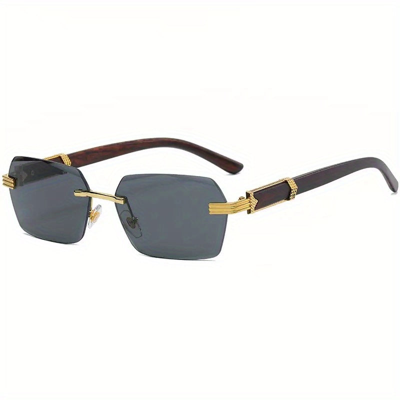 Unisex Rimless Rectangular Glasses with Faceted Lenses and Imitation Wood Temples
