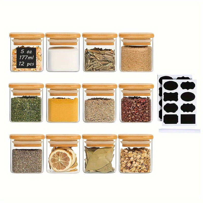 12 Glass Spice Jars Set with Bamboo Lids and Labels, Square Containers for Seasonings