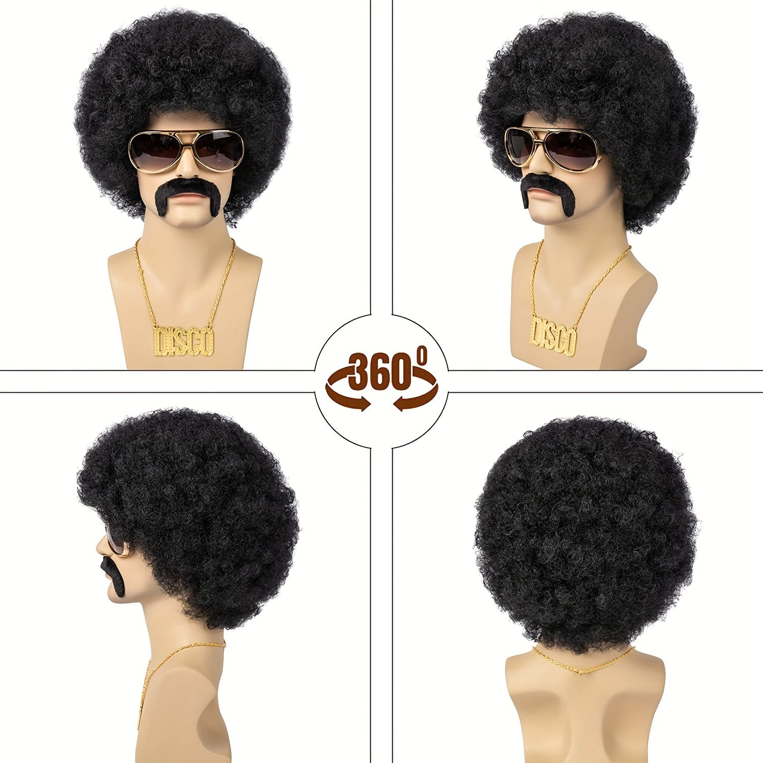 Men's 70s Costume Set with Black Curly Wig Glasses Necklace Beard