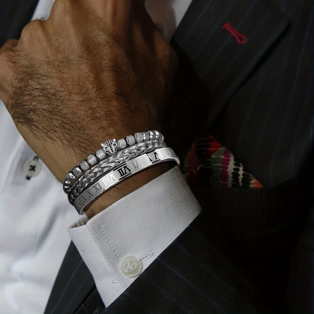 Handmade Woven Bracelets for Men with Leopard Head Roman Numerals Stainless Steel Beads