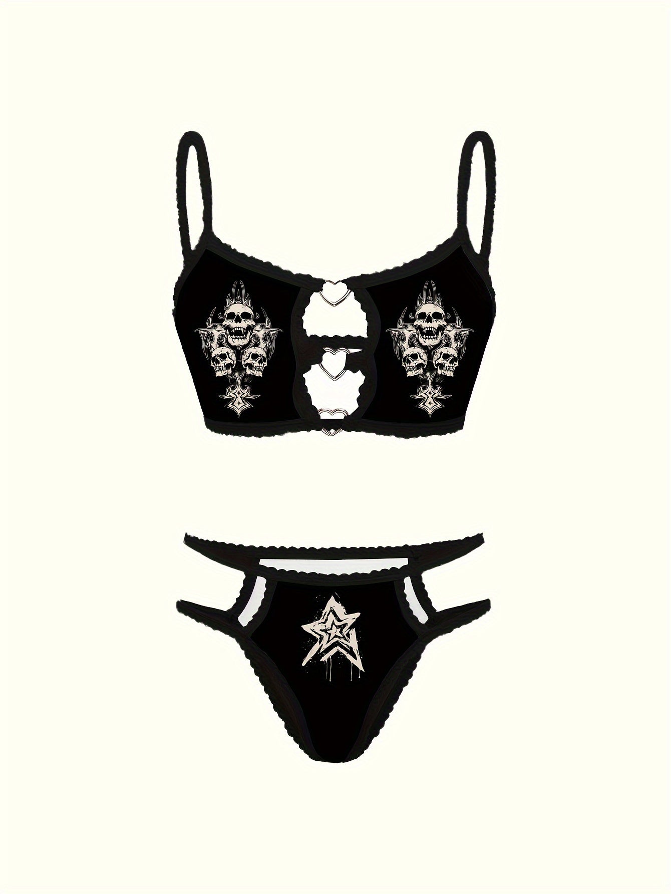 Skull Star Print Lace Trim Lingerie Set with Bra and Thong