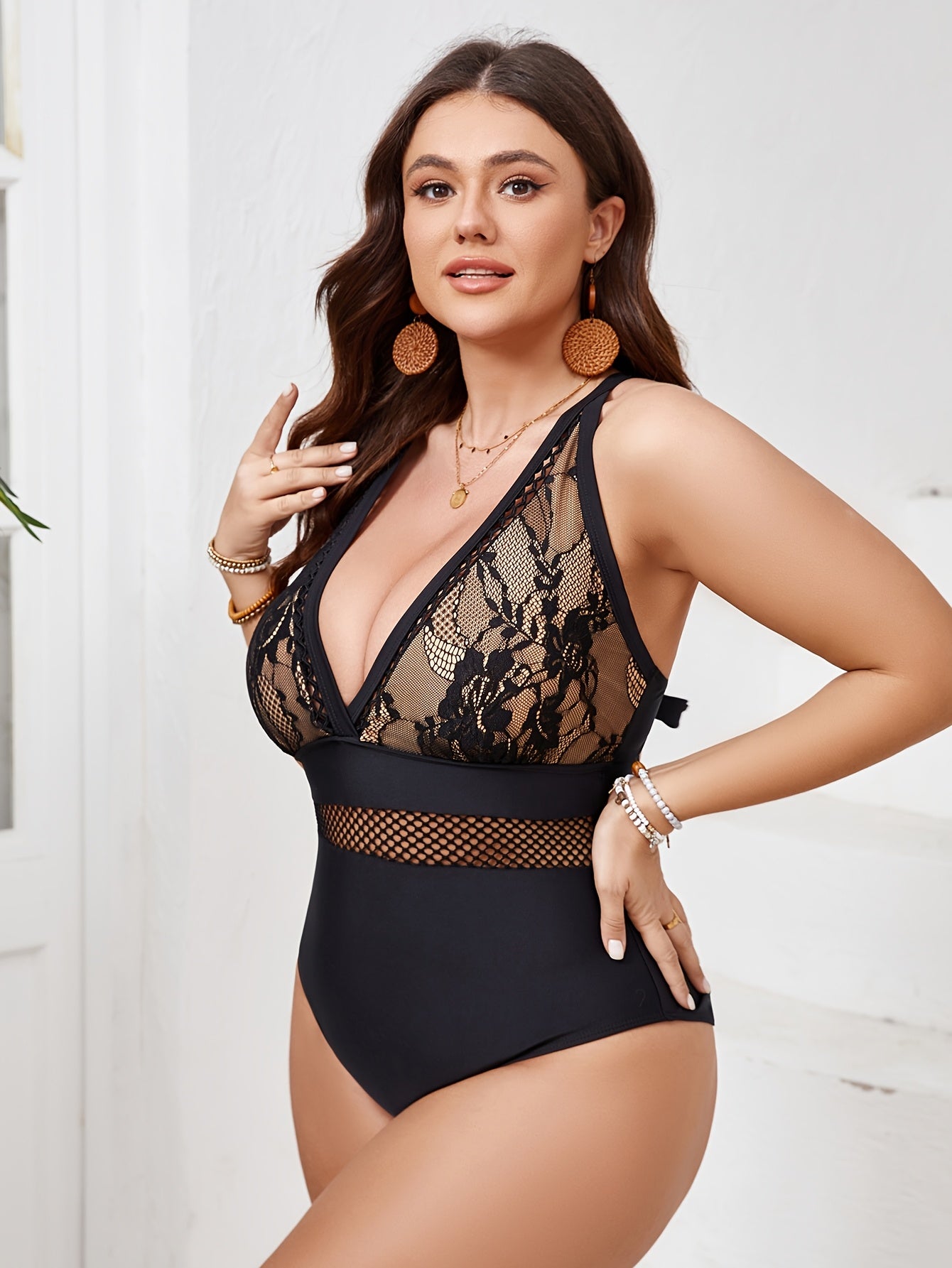 Plus Size Women's Black One-Piece Swimsuit with Lace V-Neck and Removable Pads