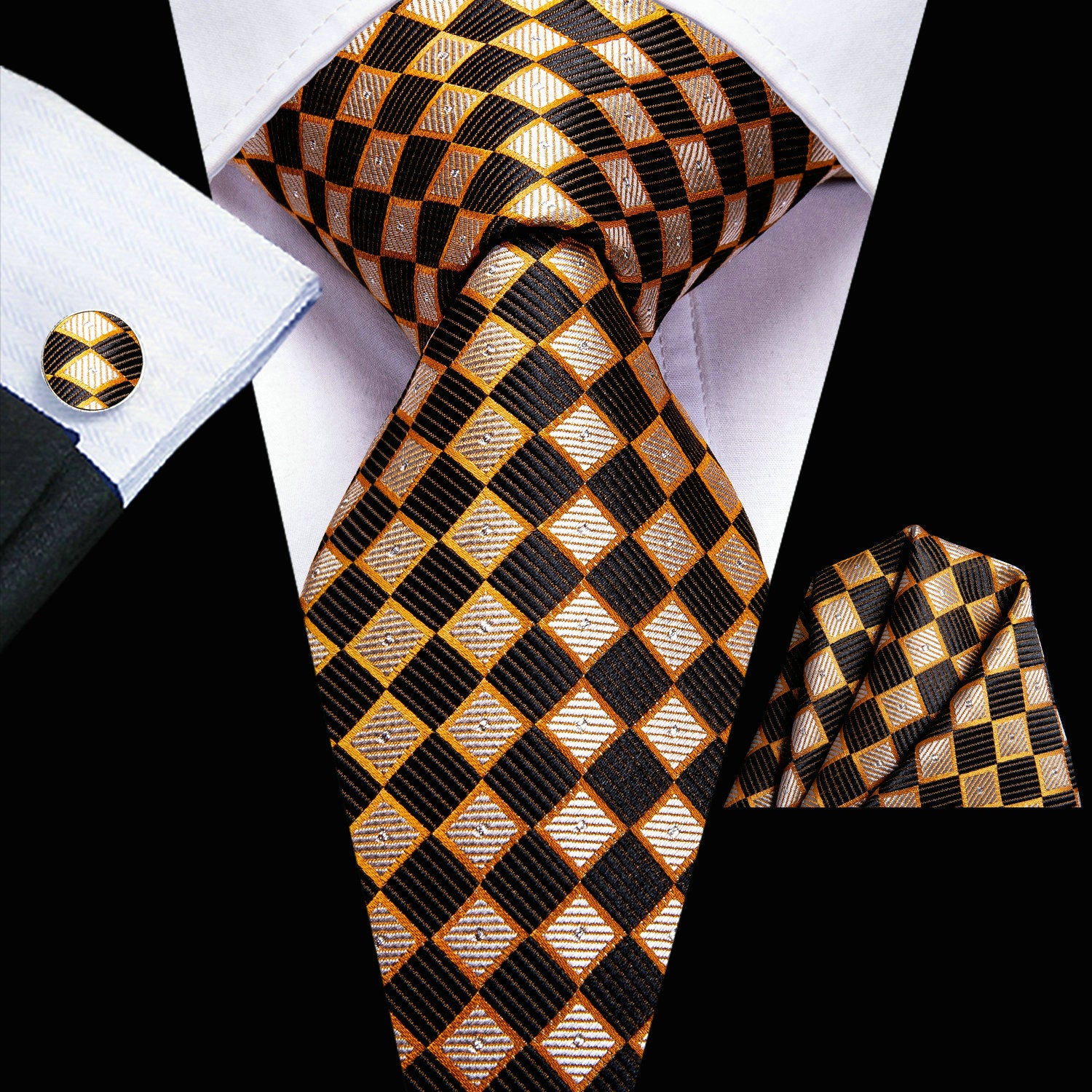 Men's Plaid Necktie Set with Hanky and Cufflinks for Weddings Business and Parties