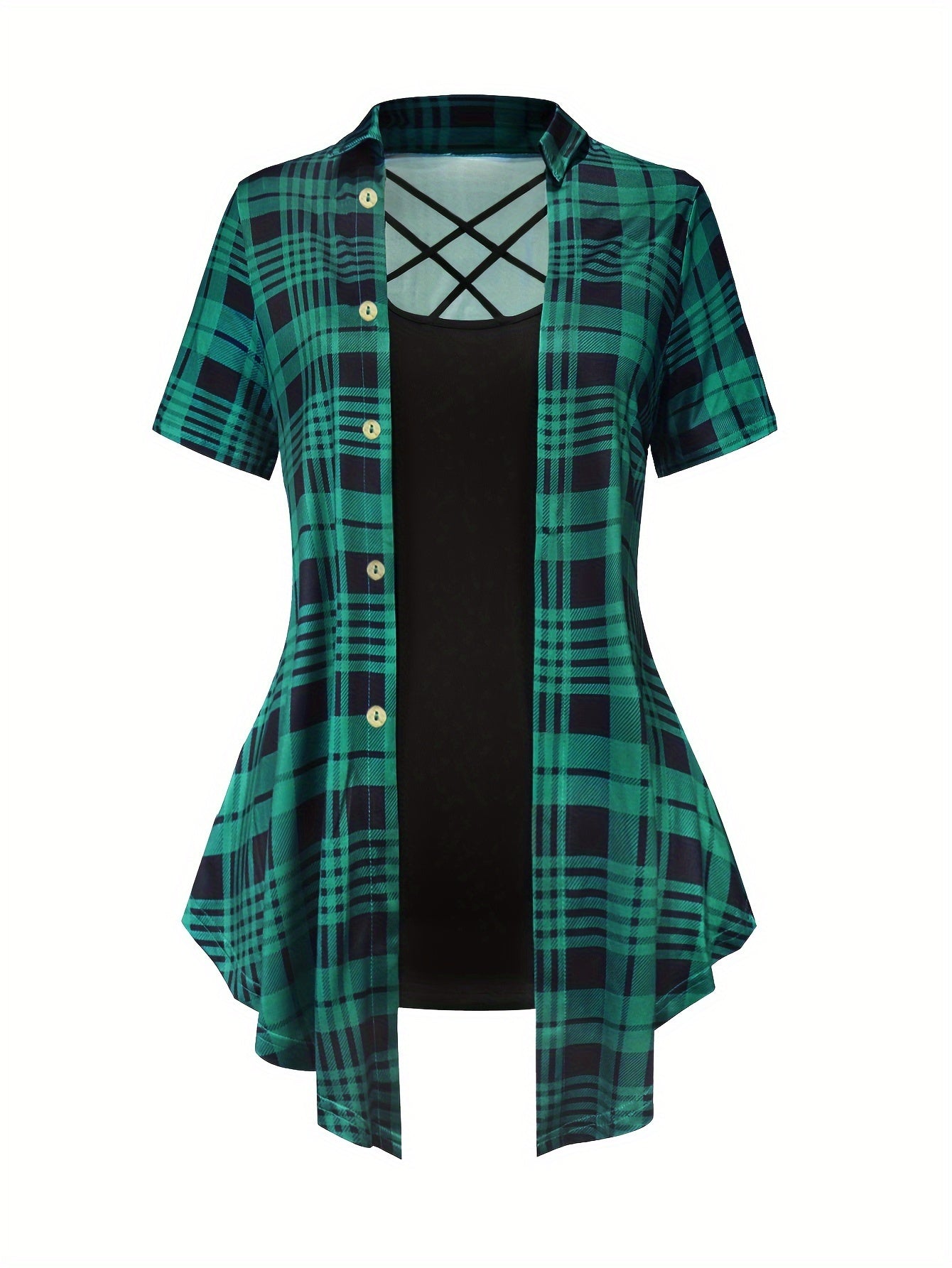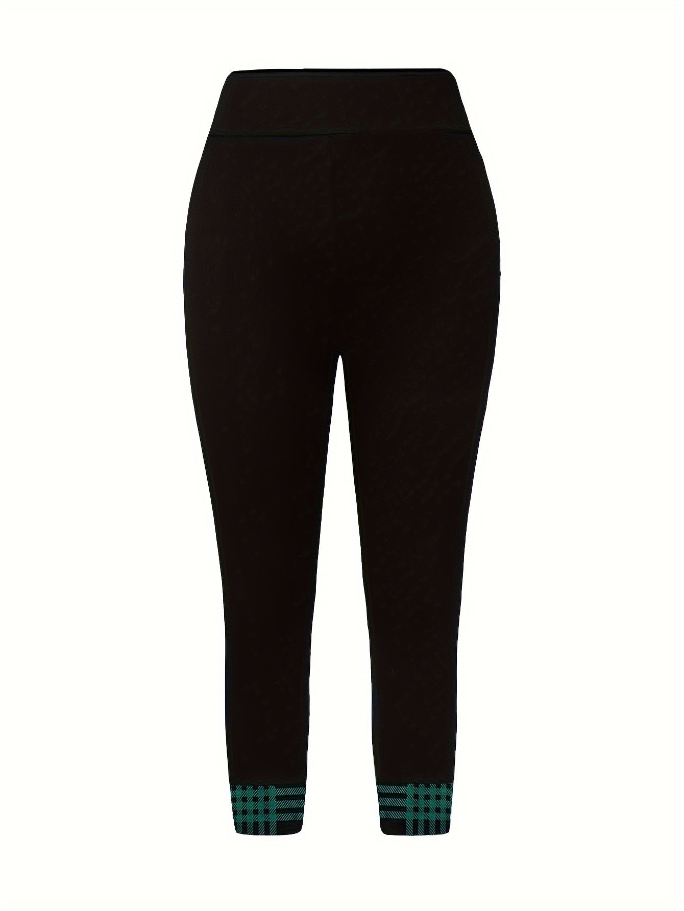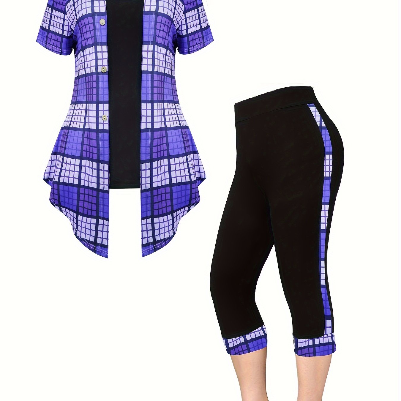 Plus Size V Neck Short Sleeve Top and Plaid Capris Pants Loungewear Set in Polyester