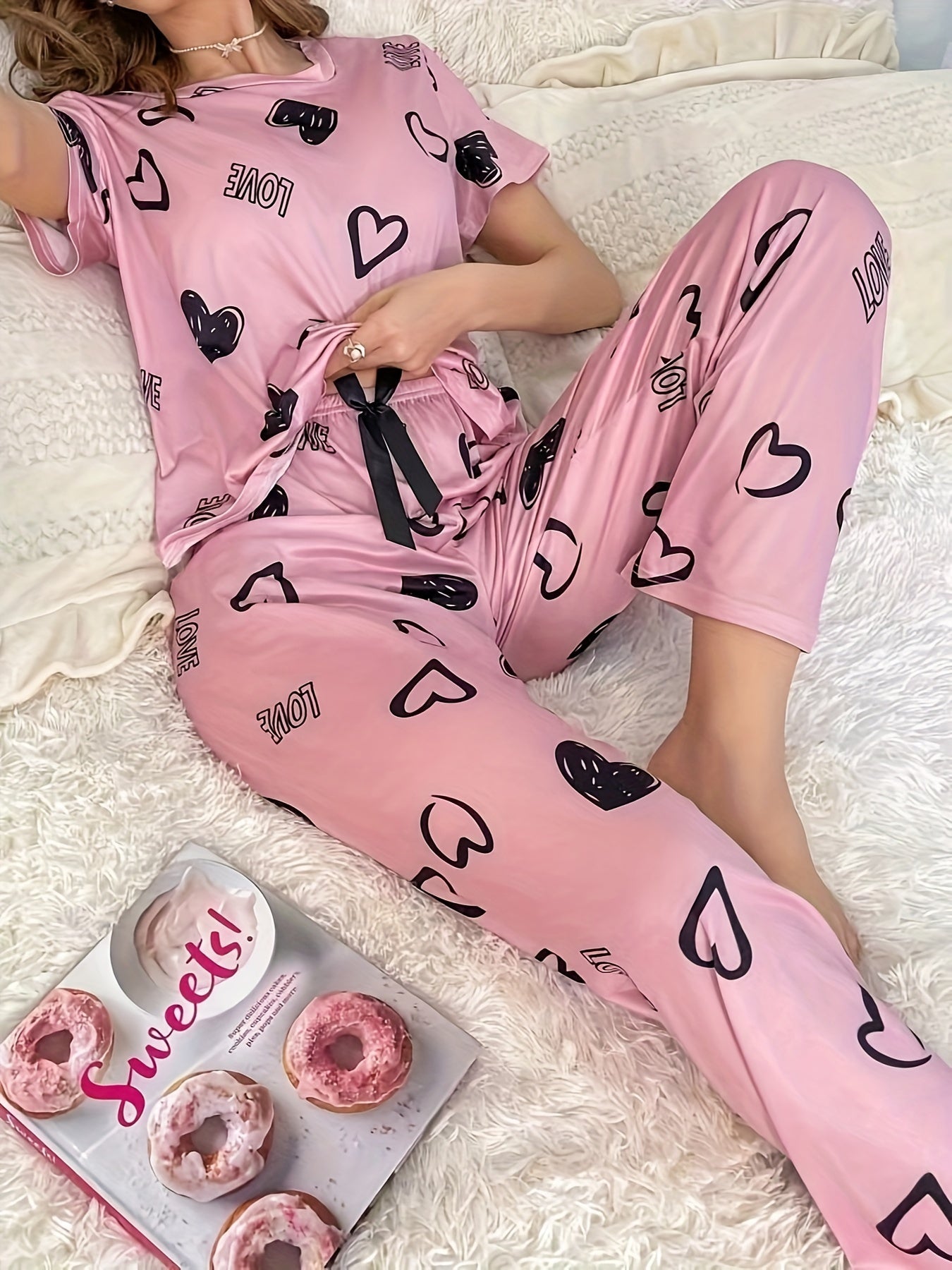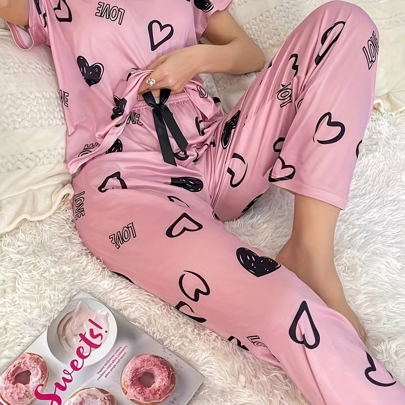 Women's Valentine's Day Pajama Set Heart Letter Print Short Sleeve Top Elastic Pants Sleepwear Loungewear