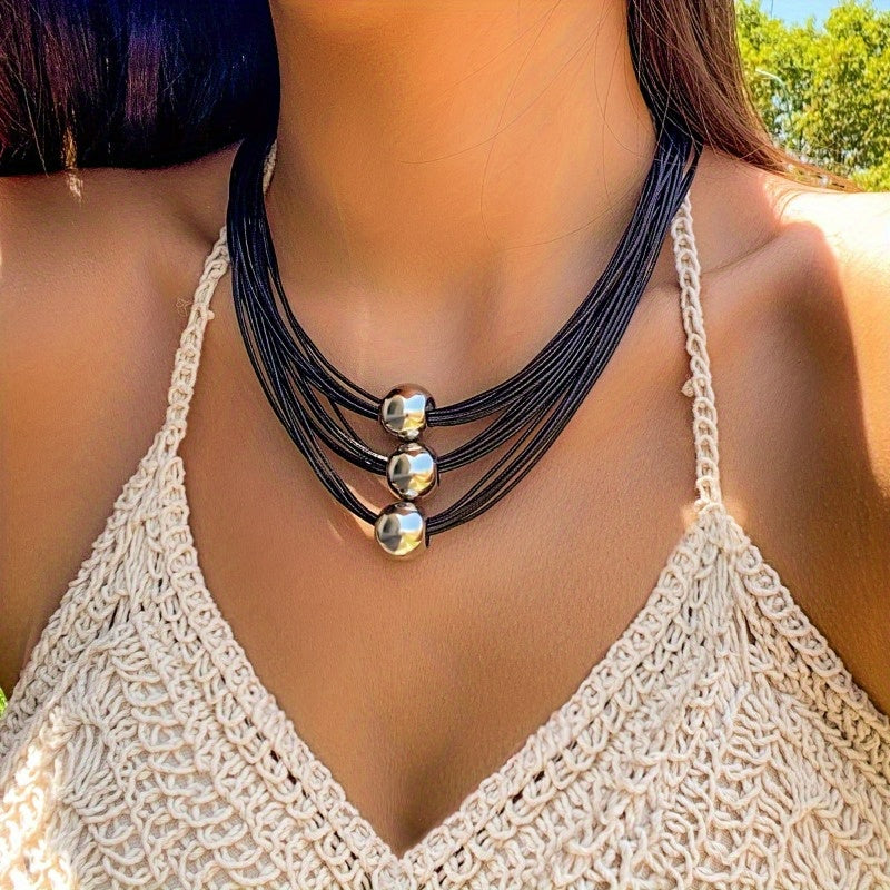 Black Beaded Necklace with Multilayer Design and Metallic Spherical Accents for Parties