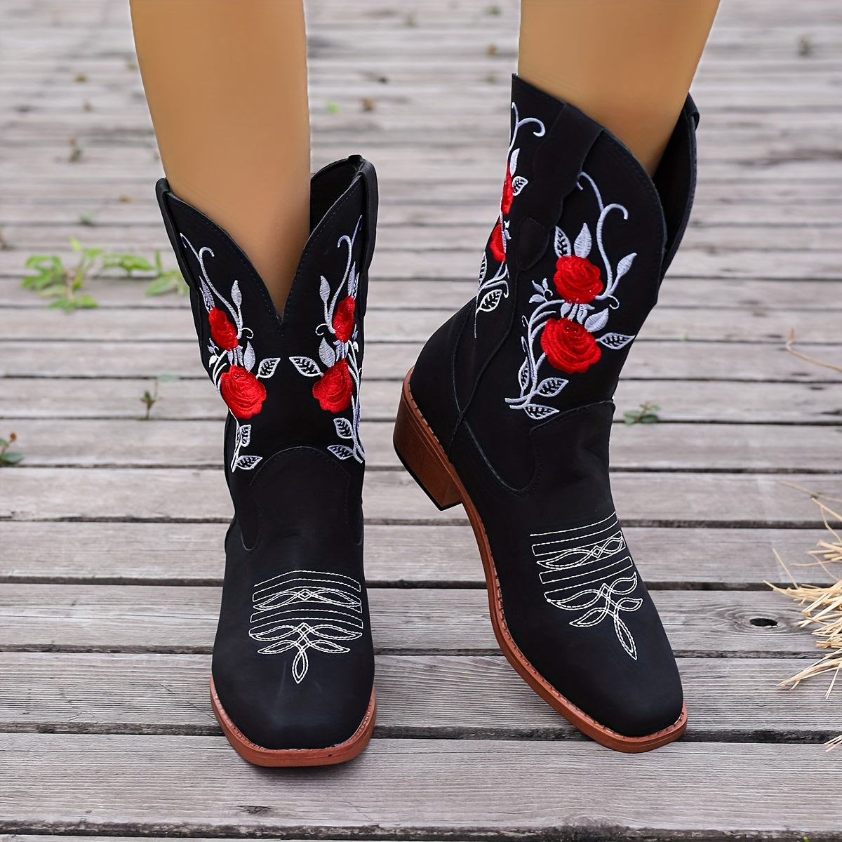 Women Embroidered Western Cowboy Boots Black Red Floral Mid-Calf Comfortable Slip-On
