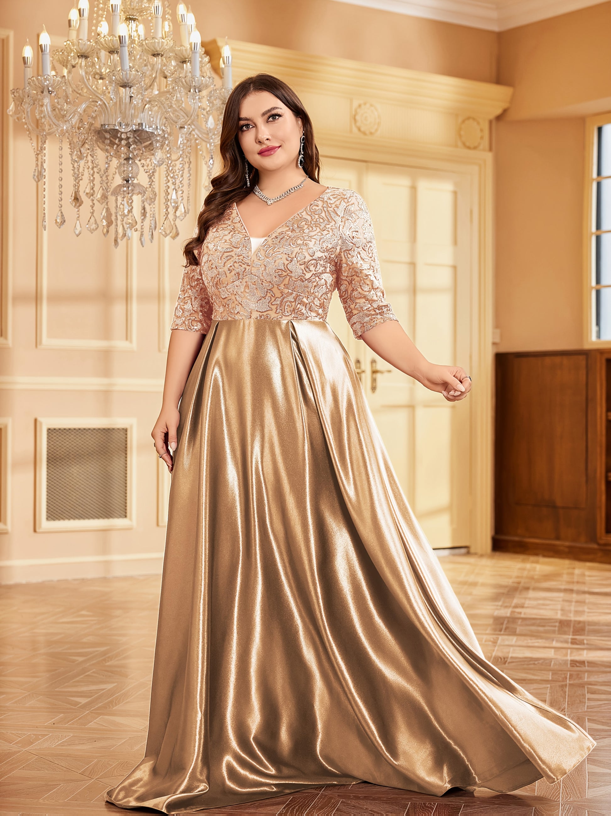 Women Long Dress Solid Color Mid-Sleeve Sequin Party Evening Gown