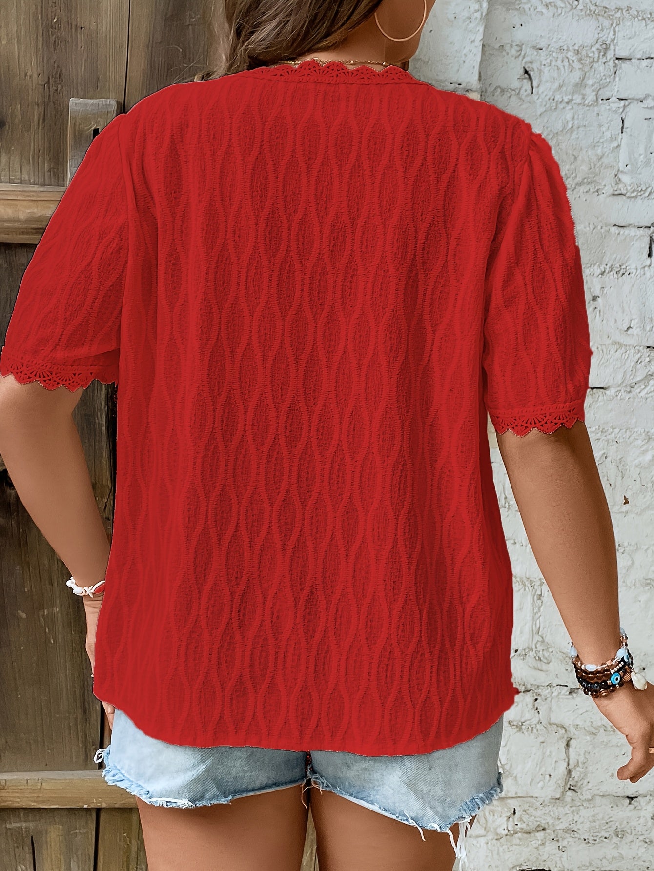 Women Plus Size Lace Top V-Neck Ruffled Sleeve Green Casual Blouse