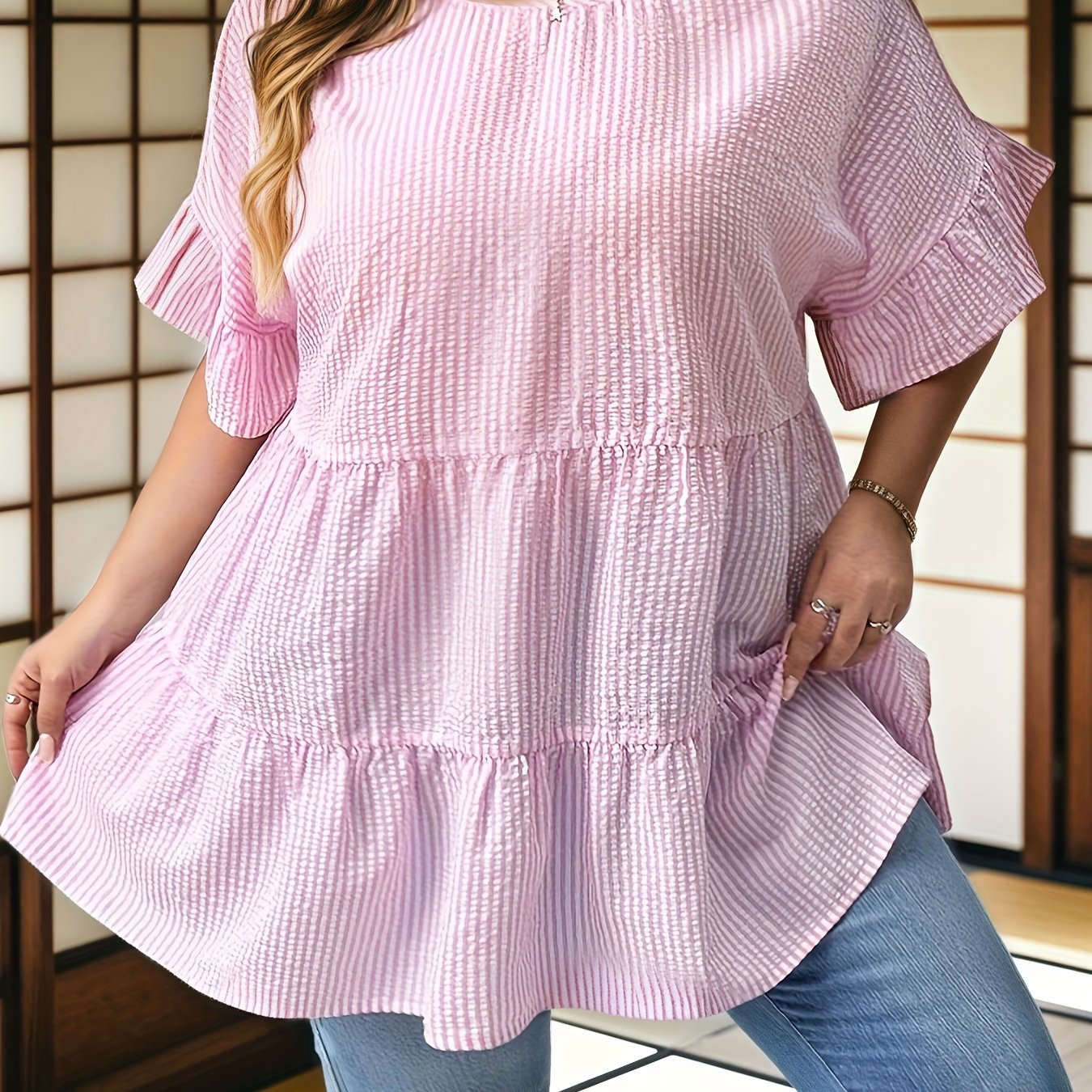 Women Plus Size Striped Ruffle Collar Short Sleeve Casual Shirt for Summer