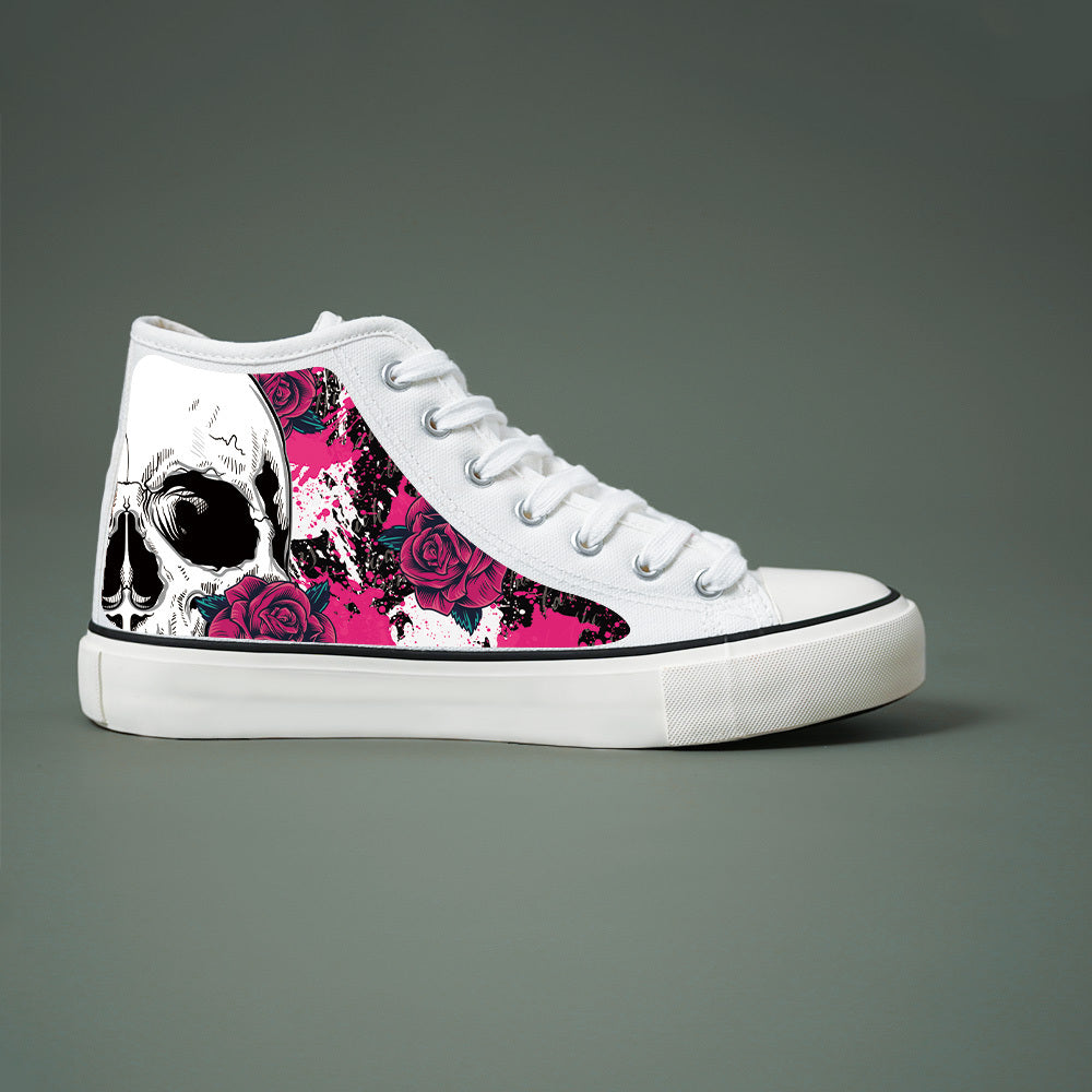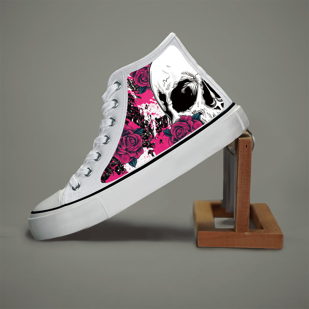 Women’s Black and White High-Top Sneakers with Skull and Roses Design