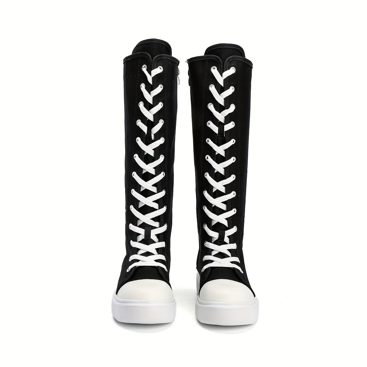 Women's Black Knee-High Lace-Up Leather Boots with Zippers