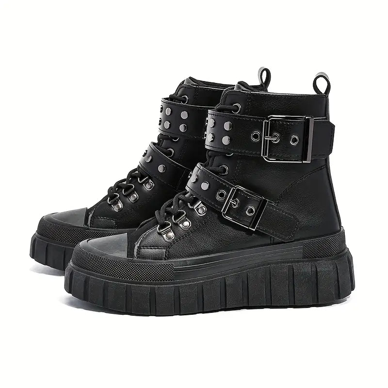 Women's Black Leather Motorcycle Boots with Metal Buckles and Platform Sole