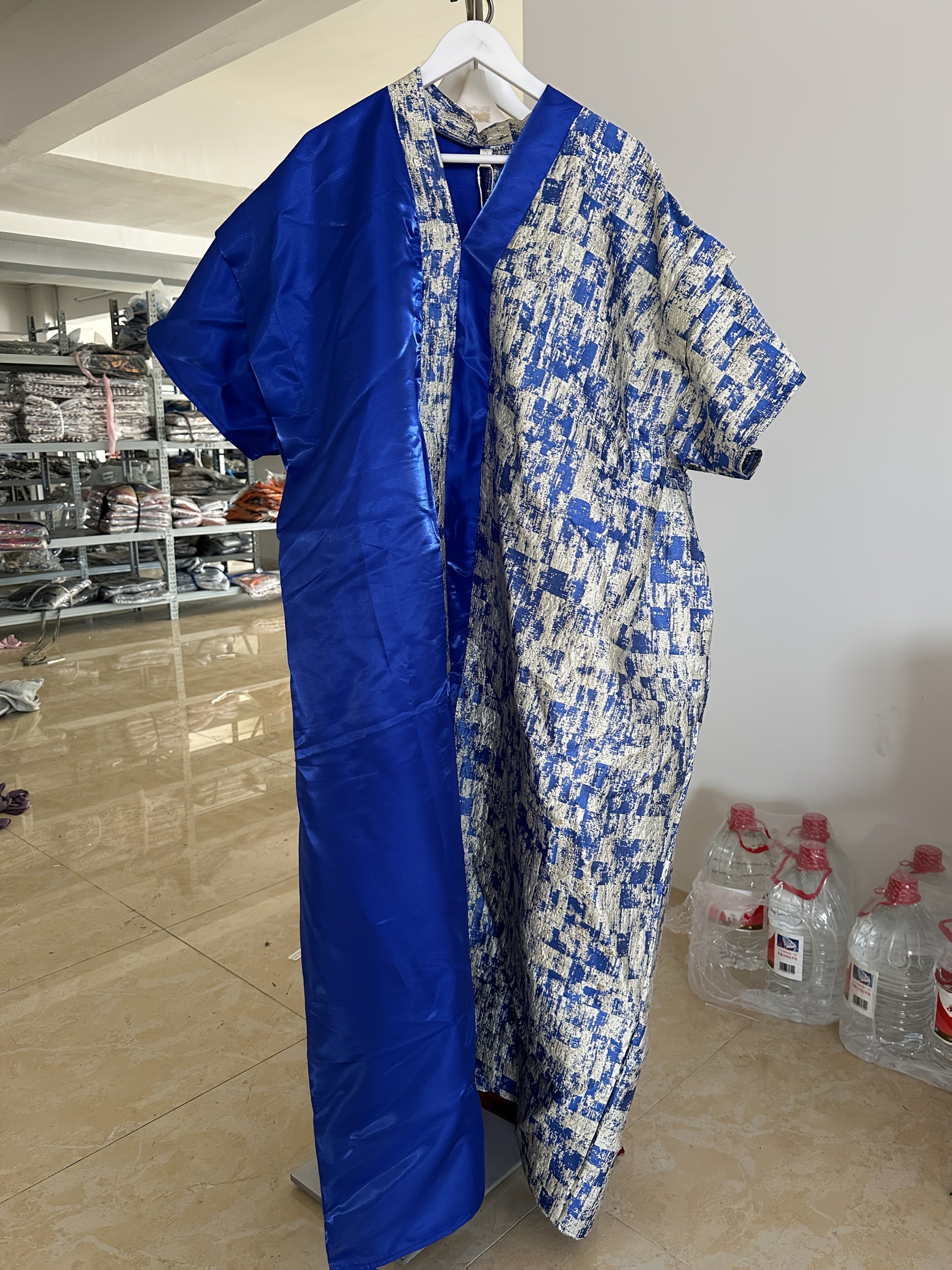 Women's Blue Gold Floral Jacquard Kaftan Dress with V-Neck Long Sleeves