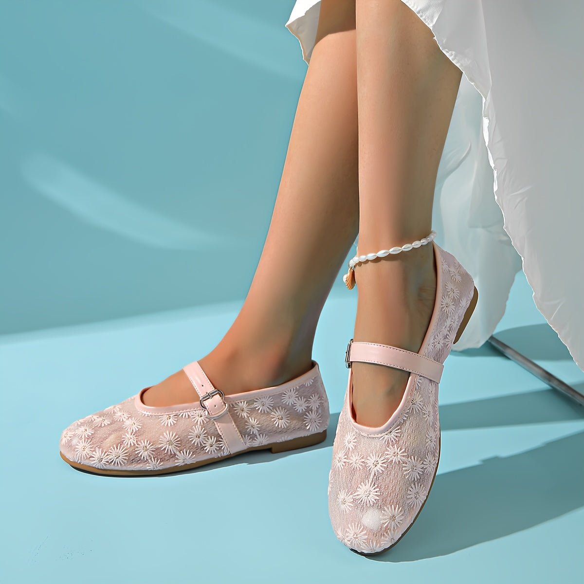 Women's Breathable Mesh Slip-On Ballet Flats with Adjustable Strap Lightweight Casual Shoes for All Seasons, White and Pink Embroidery