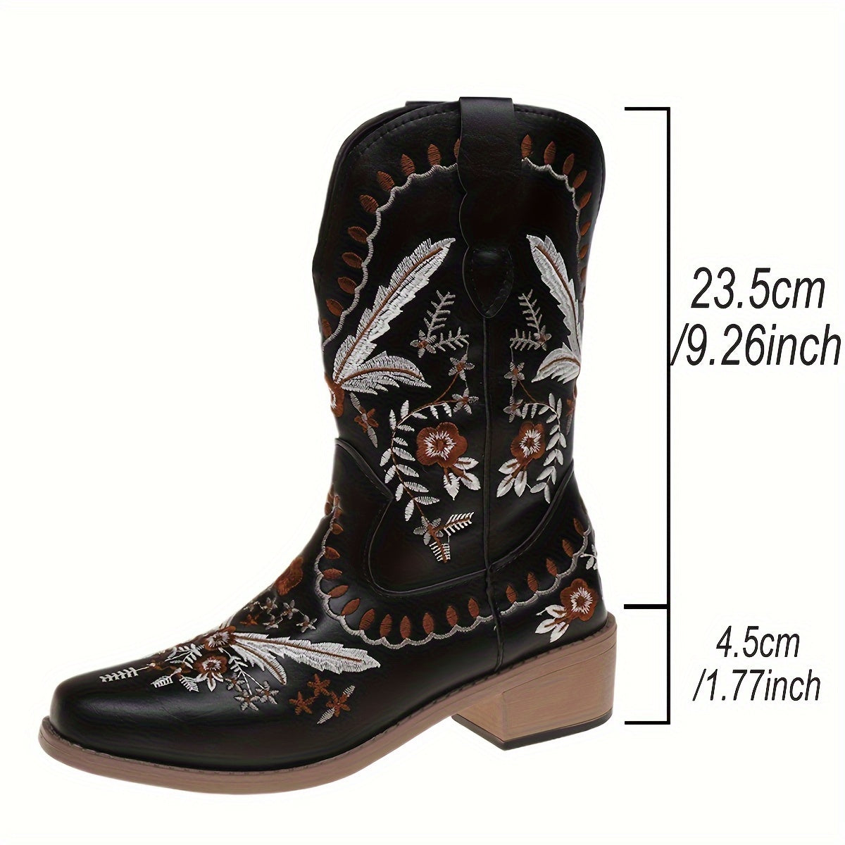 Women's Brown Embroidered Mid-Calf Boots with Thick Heel for Fall Winter