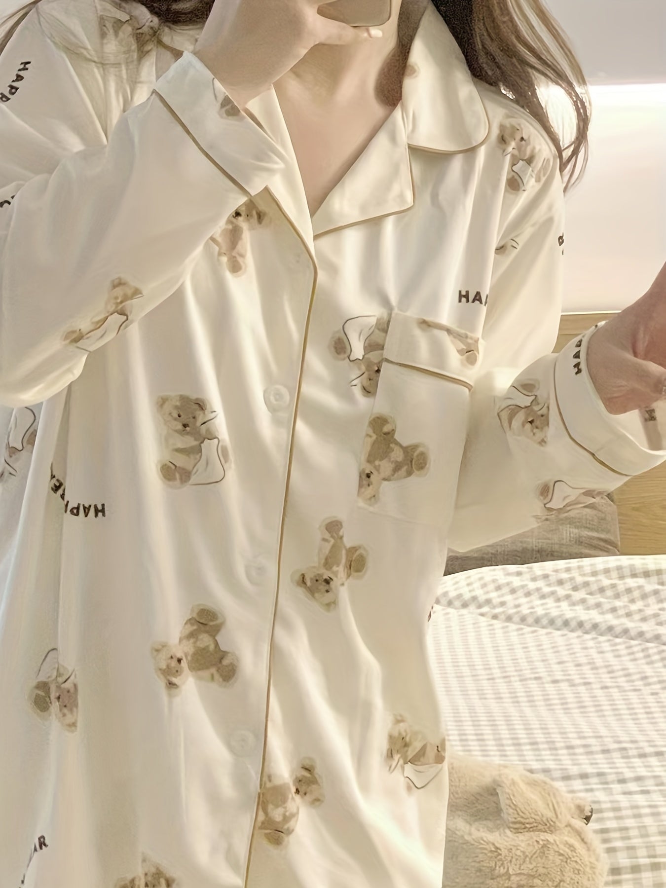 Women's Cartoon Bear Print Pajama Set Long Sleeve Blouse and Elastic Waist Pants