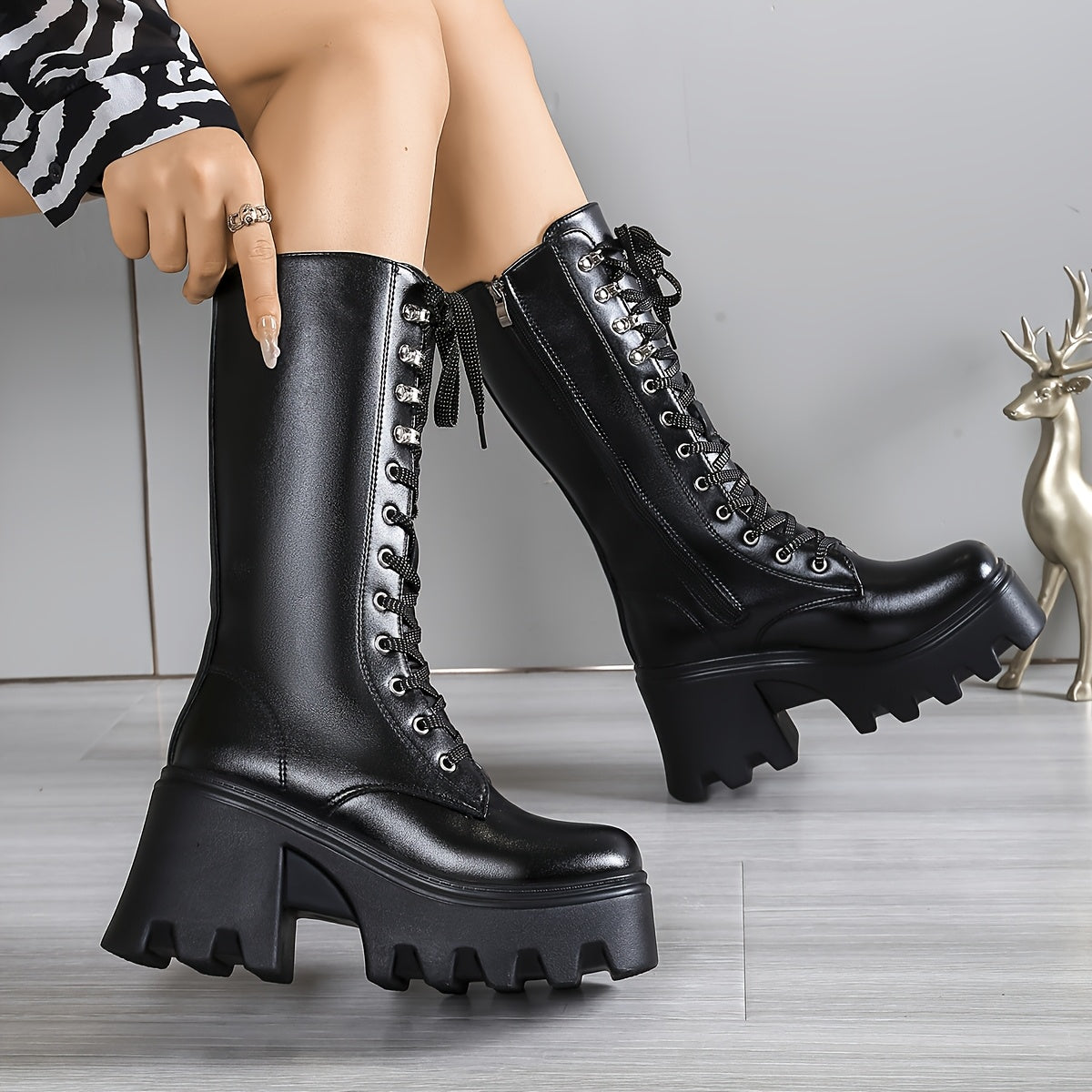 Women's Chunky Platform Boots with Side Zipper, Leather Look, All-Season Gothic Shoes