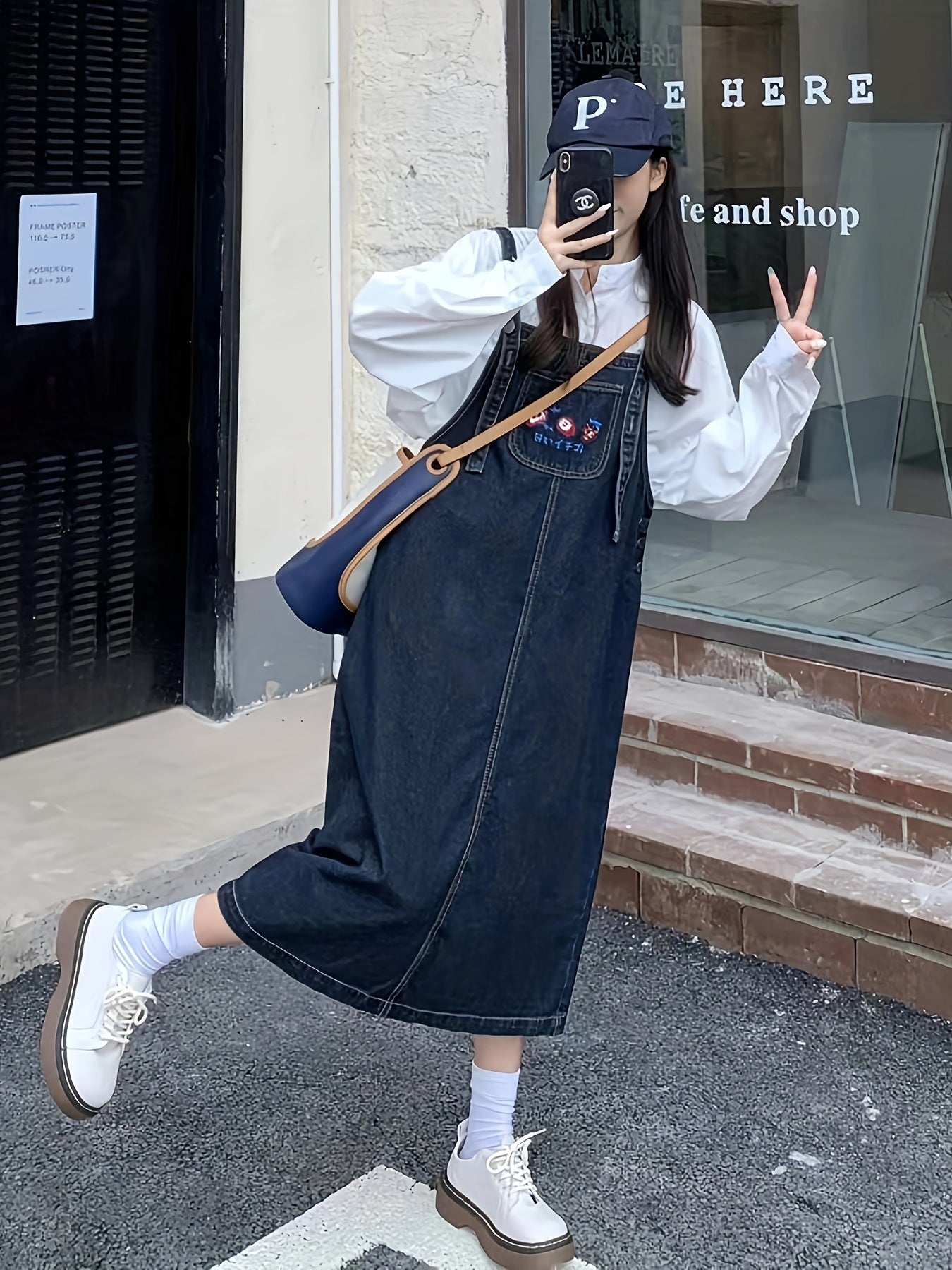 Women's Dark Wash Denim Overalls Dress with Strawberry Embroidery Pocket Casual Pinafore