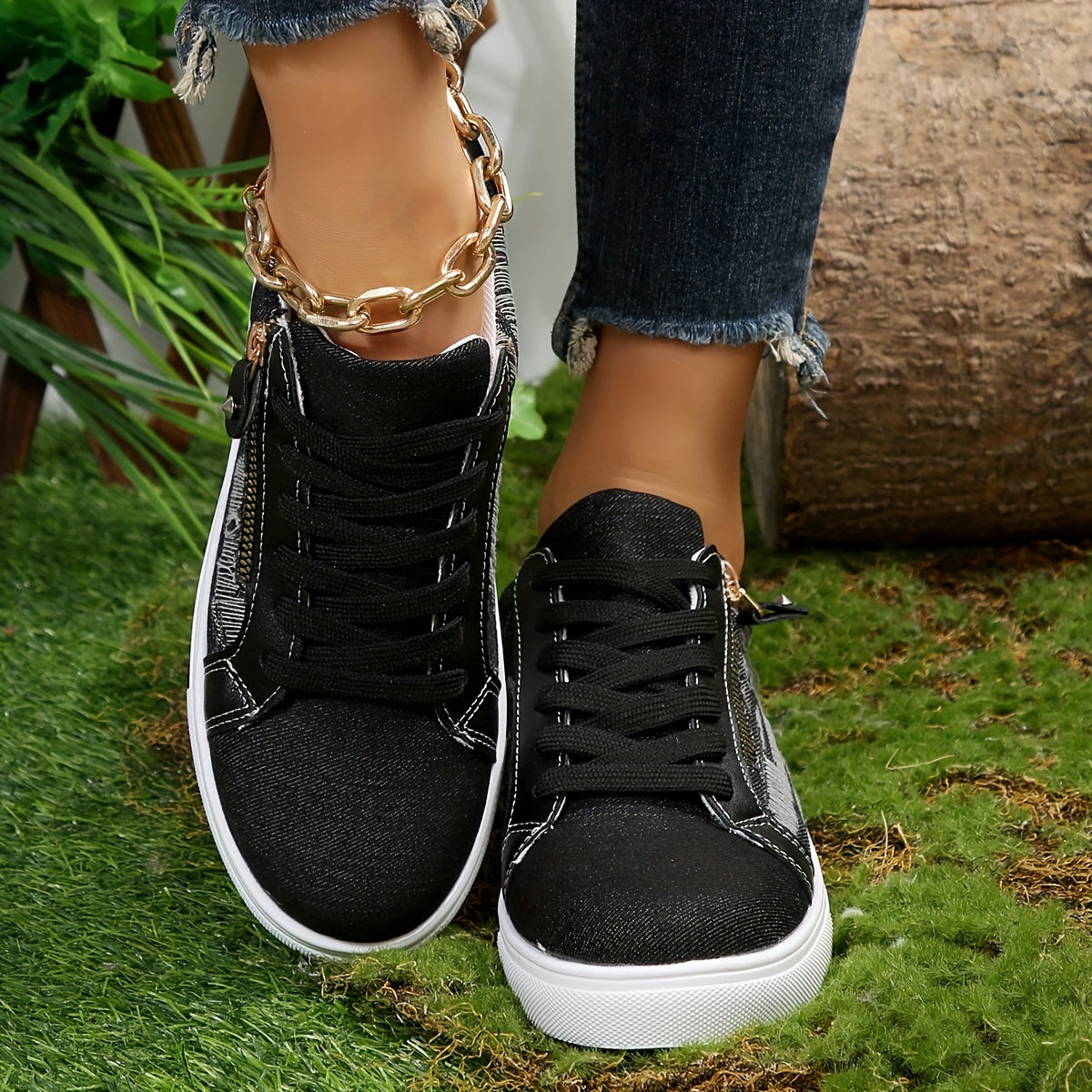 Women's Denim Flat Sneakers Casual Lace-Up Low Top Skate Shoes