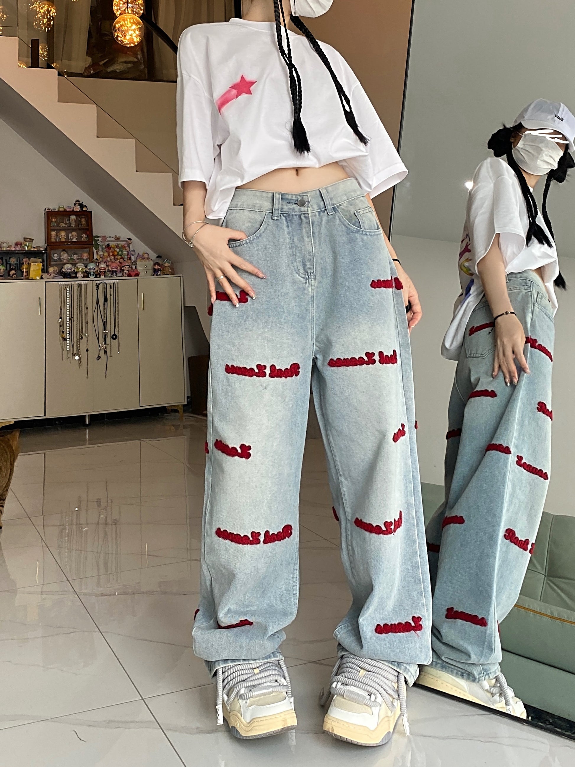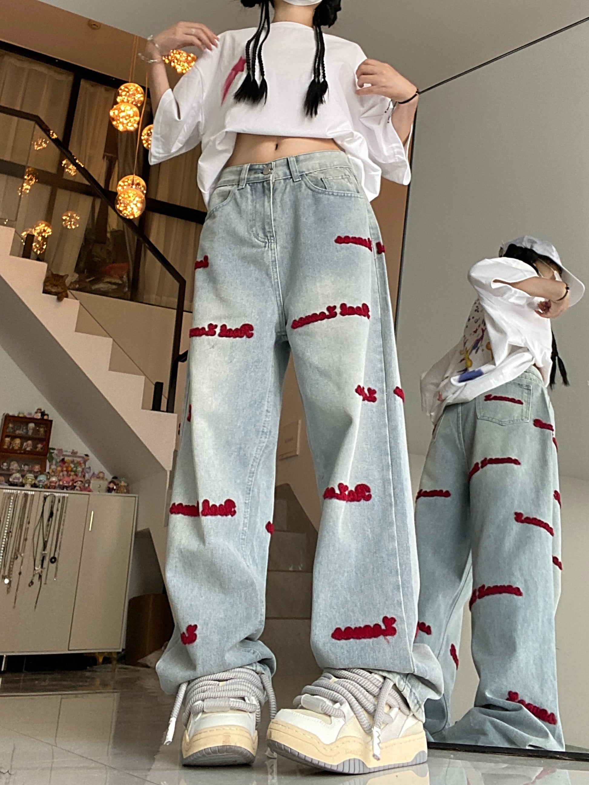 Women's Denim Jeans with Red Embroidered Lettering Regular Fit Long Stretch Fabric Casual All-Season