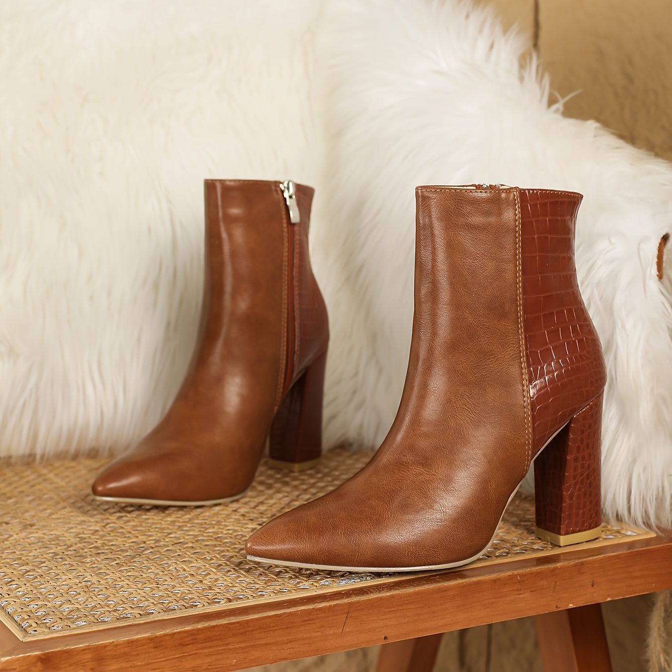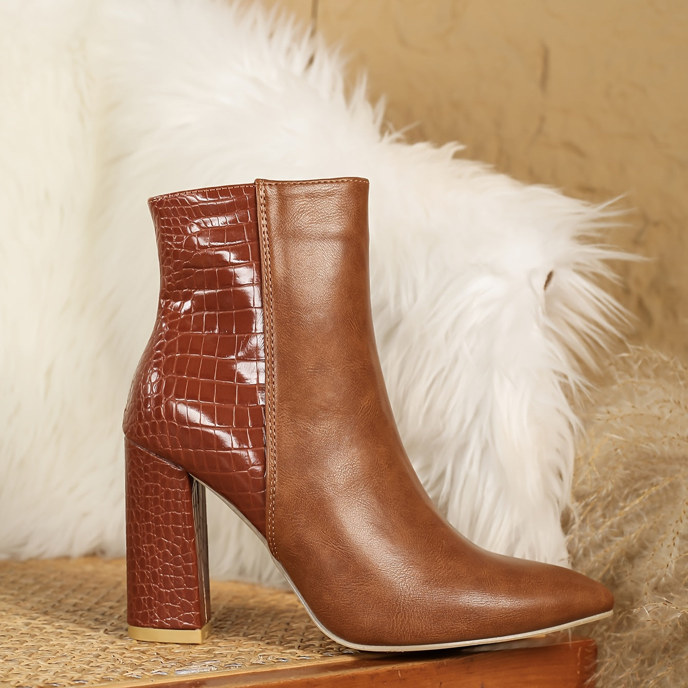Women's Faux Crocodile Pattern Ankle Boots Pointed Toe Chunky Heel Black or Brown