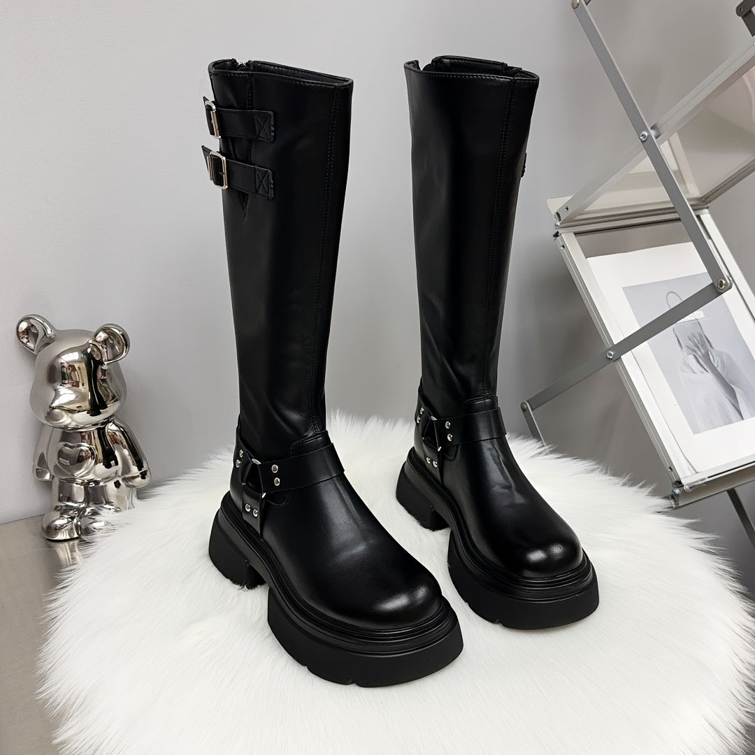 Women's Faux Leather Knee-High Platform Boots Black Buckle Straps