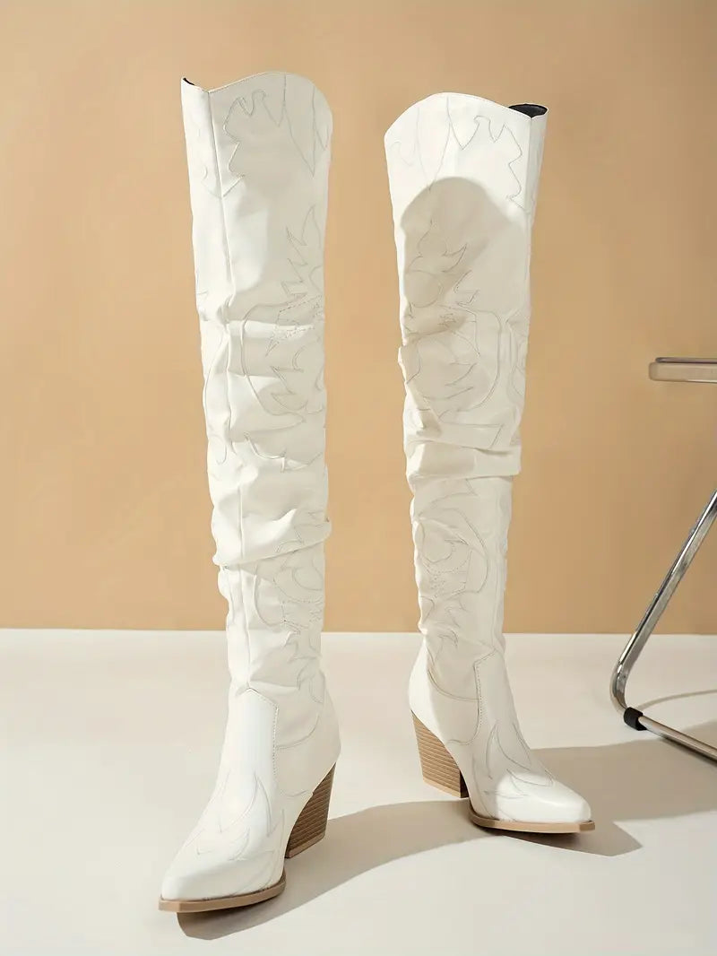 Women's Faux Leather Over-the-Knee Western Boots with Embroidery