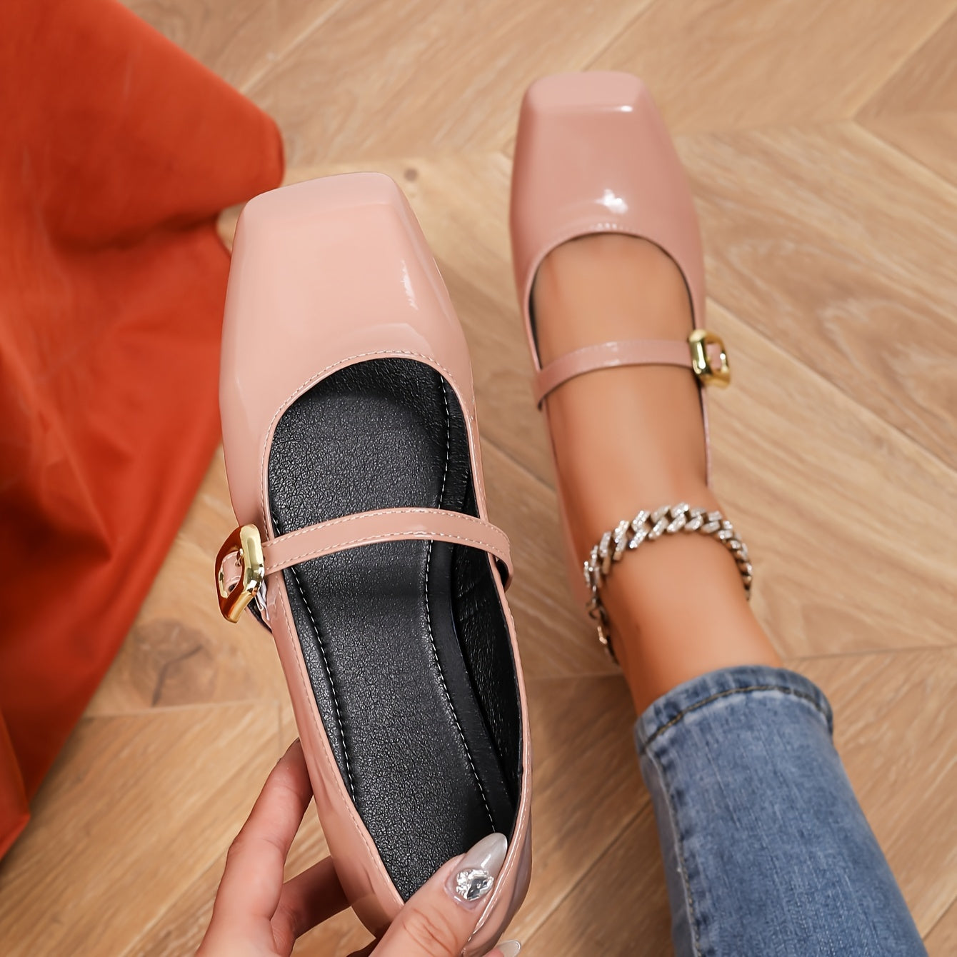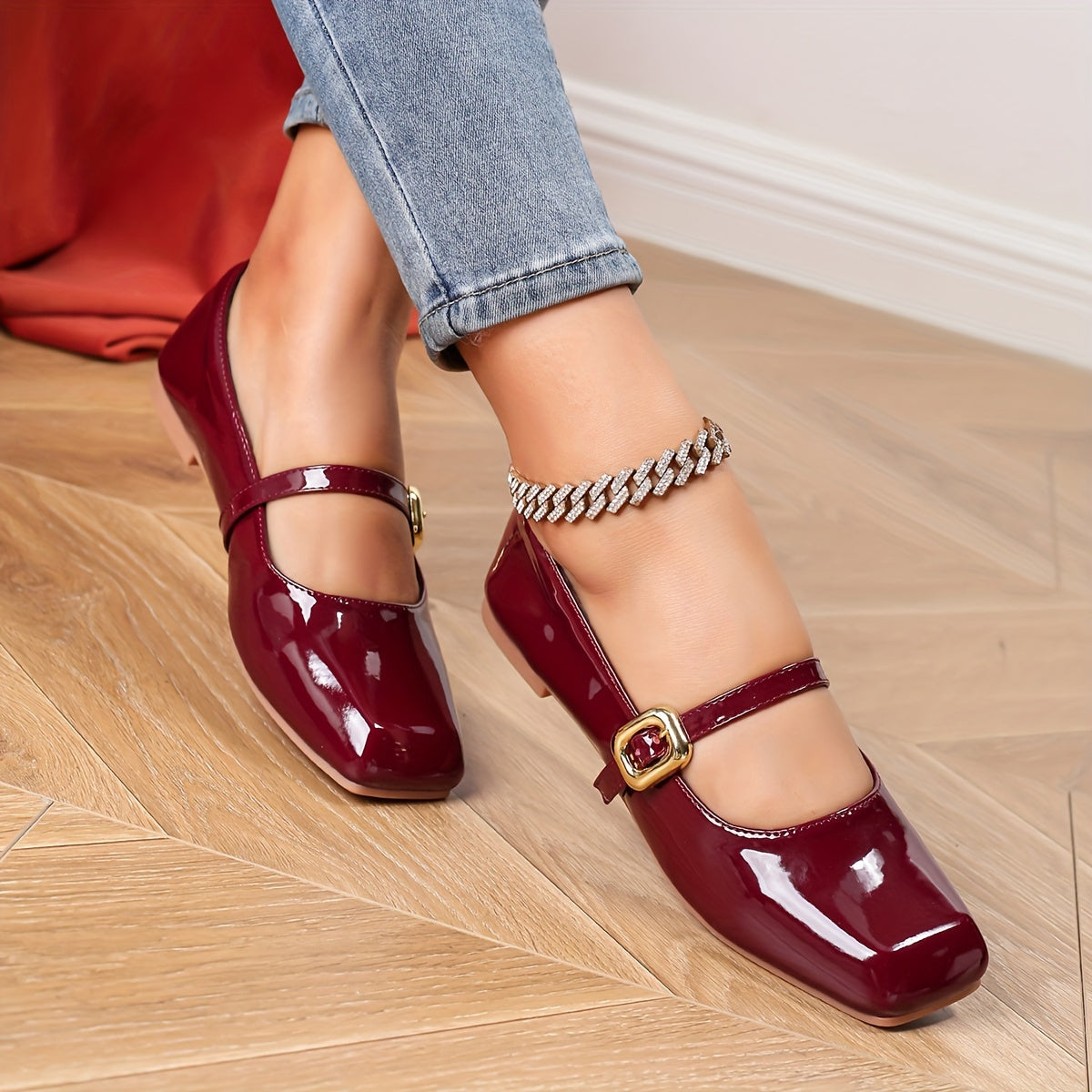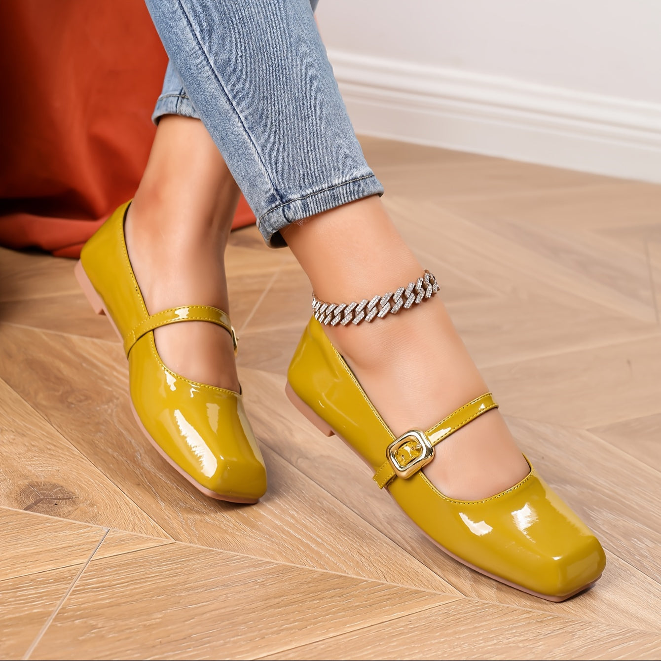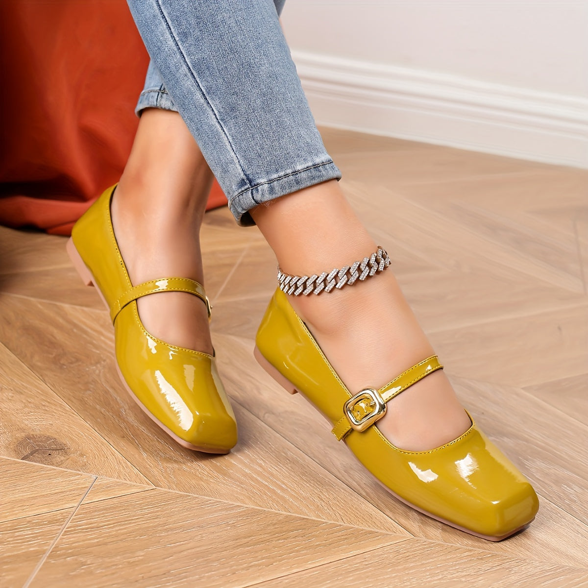 Women's Flat Shoes Mary Jane Square Toe Glitter Buckle Patent TPR Sole