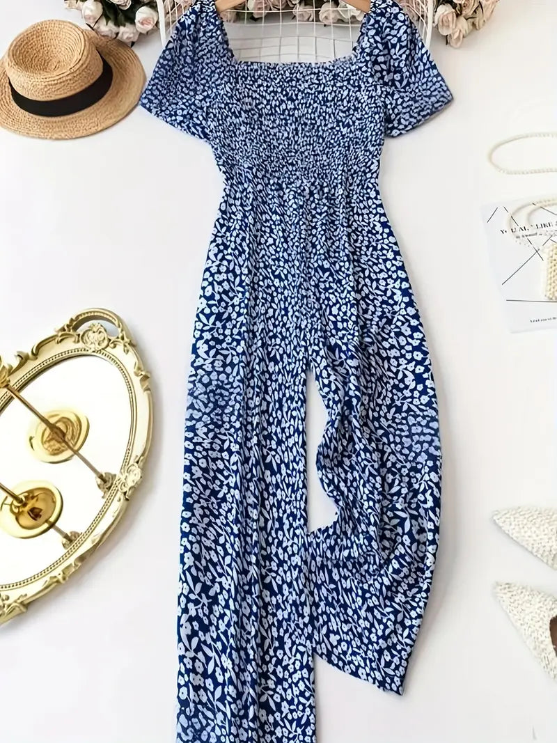 Women's Floral Print High-Waisted Jumpsuit Blue and White Casual Formal