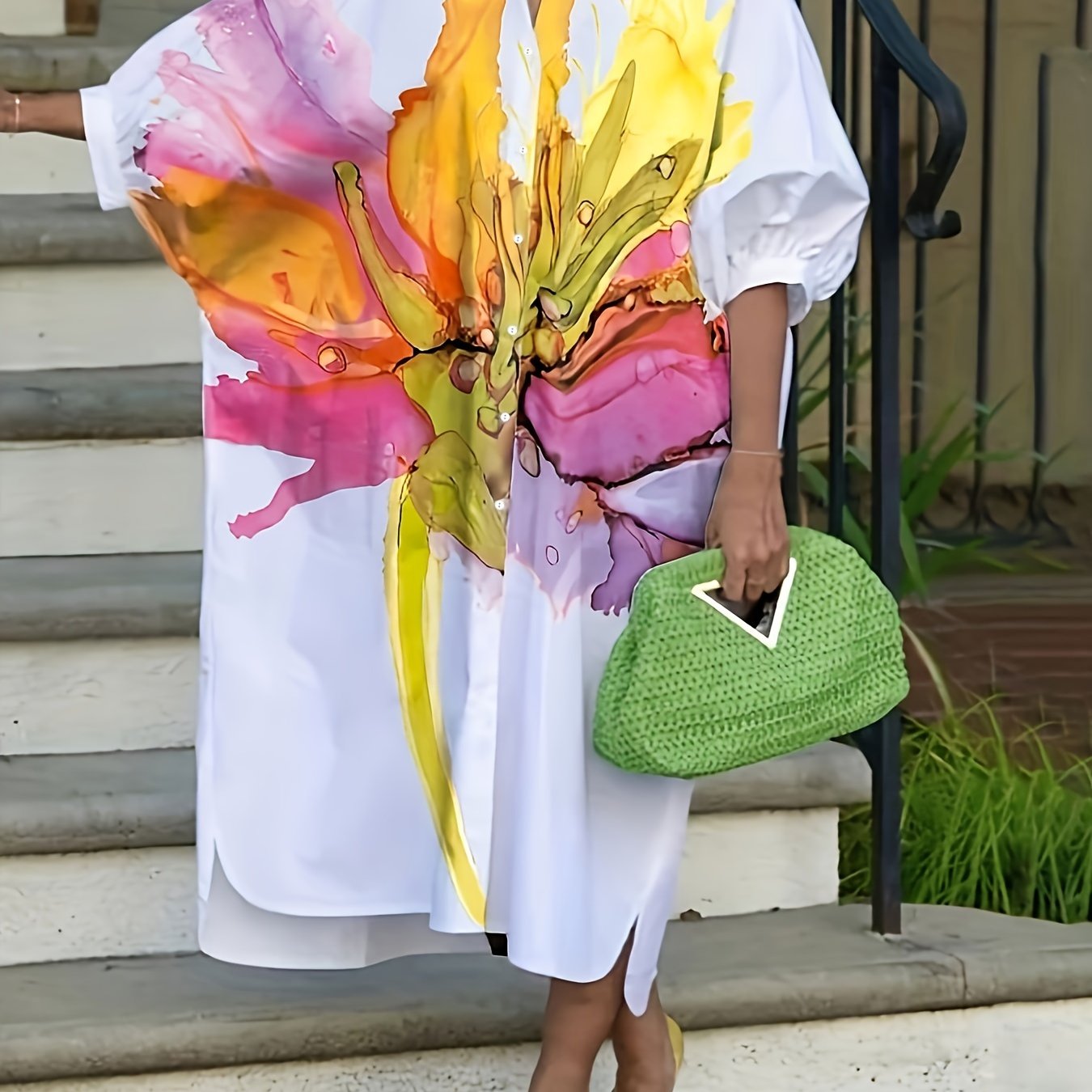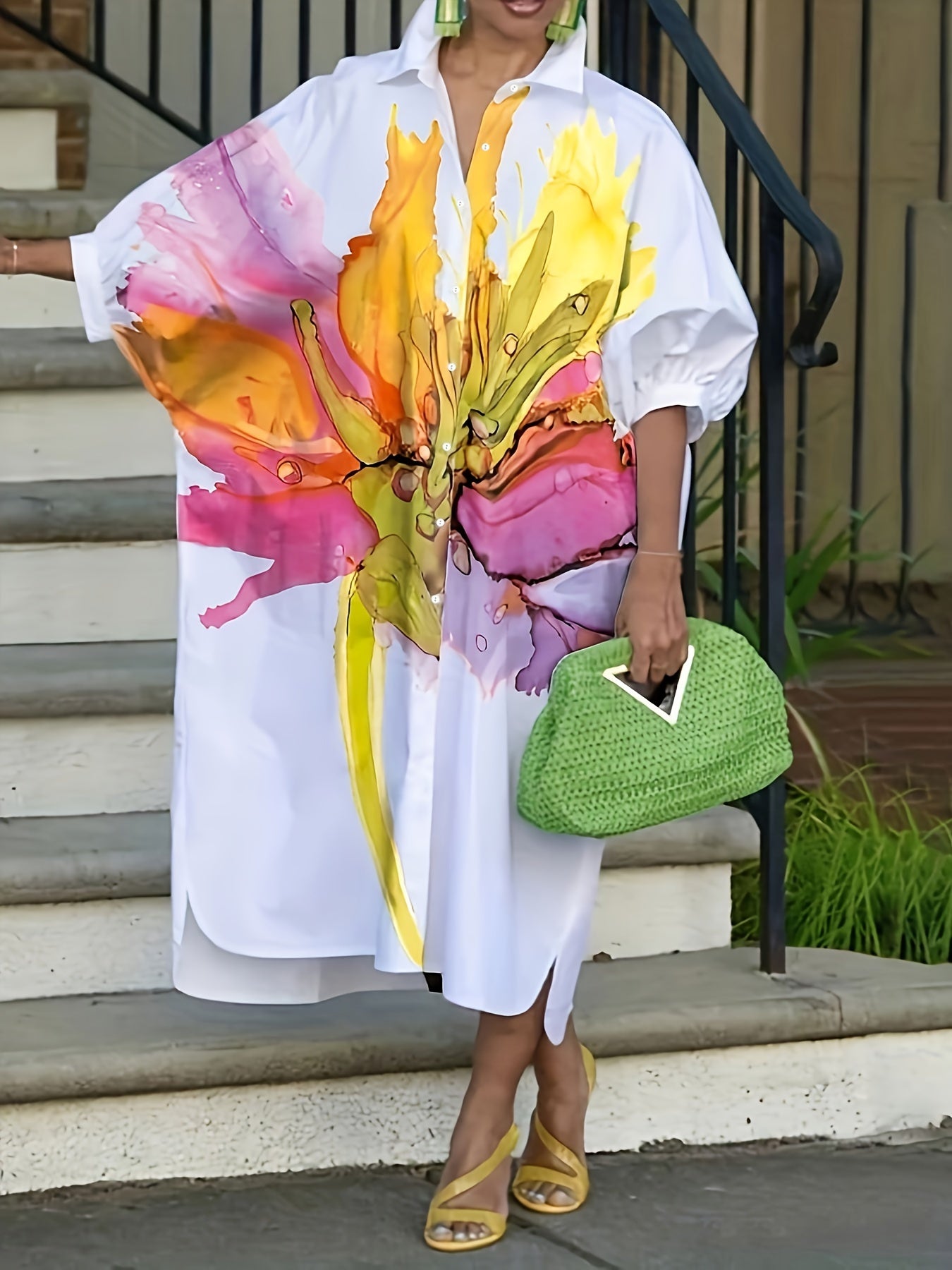 Women's Floral Print Mid-Length Shirt Dress with Half Sleeves and Button-Up Collar