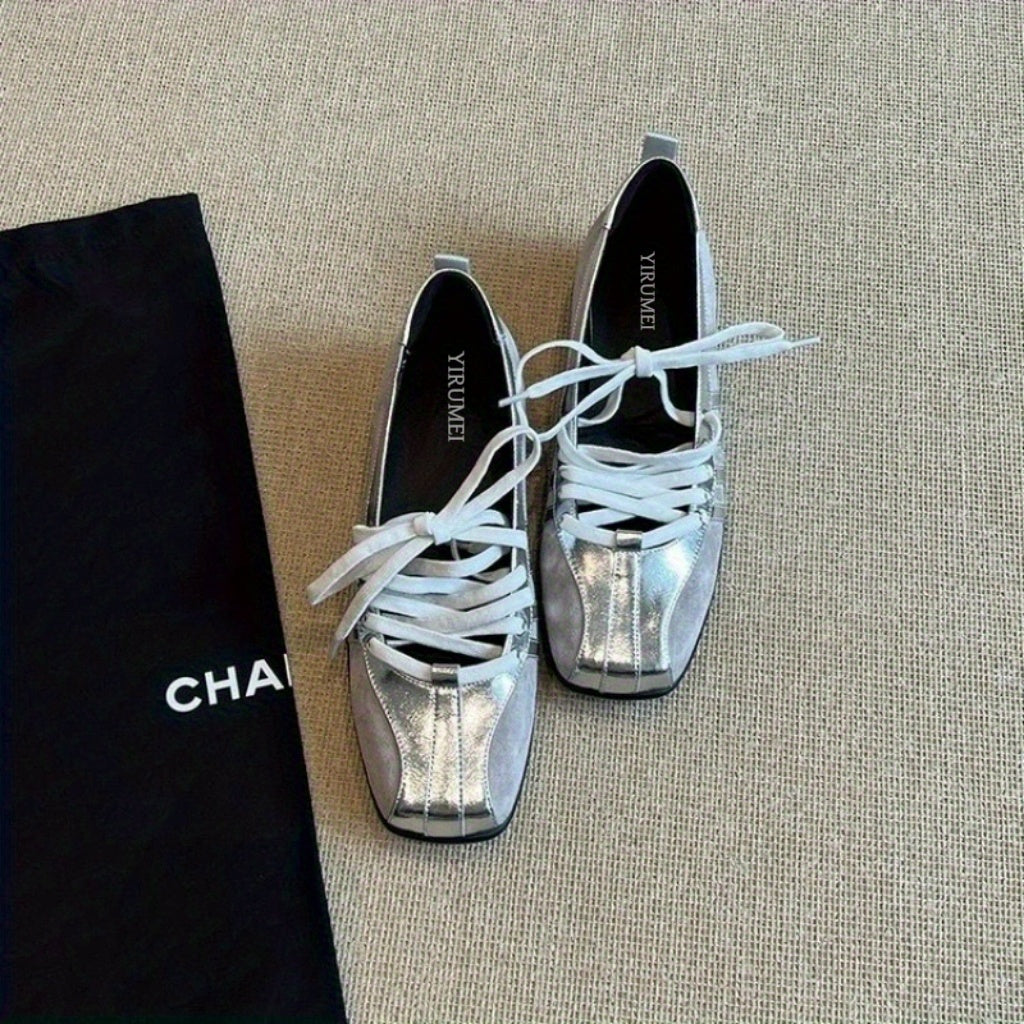 Women's French-Inspired Mary Jane Flats Square Toe Lace-Up Shoes Black White