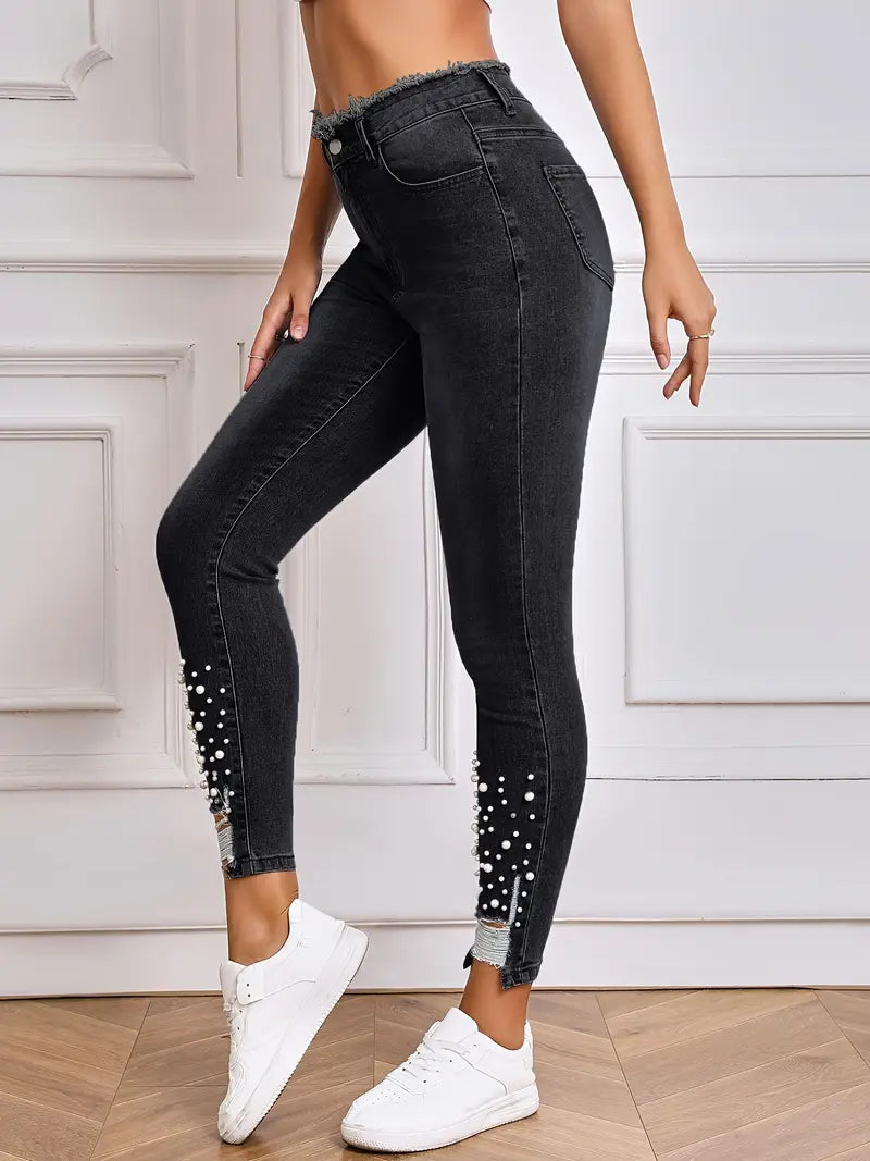 Women's High Stretch Skinny Jeans with Faux Pearl Decor for All-Season, Denim