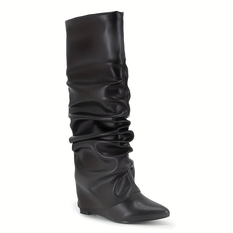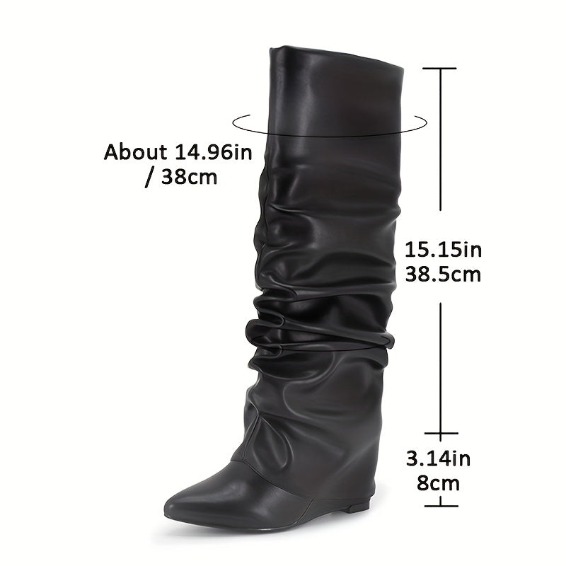 Women's Knee-High Wedge Heel Boots with Zipper and Pointed Toe