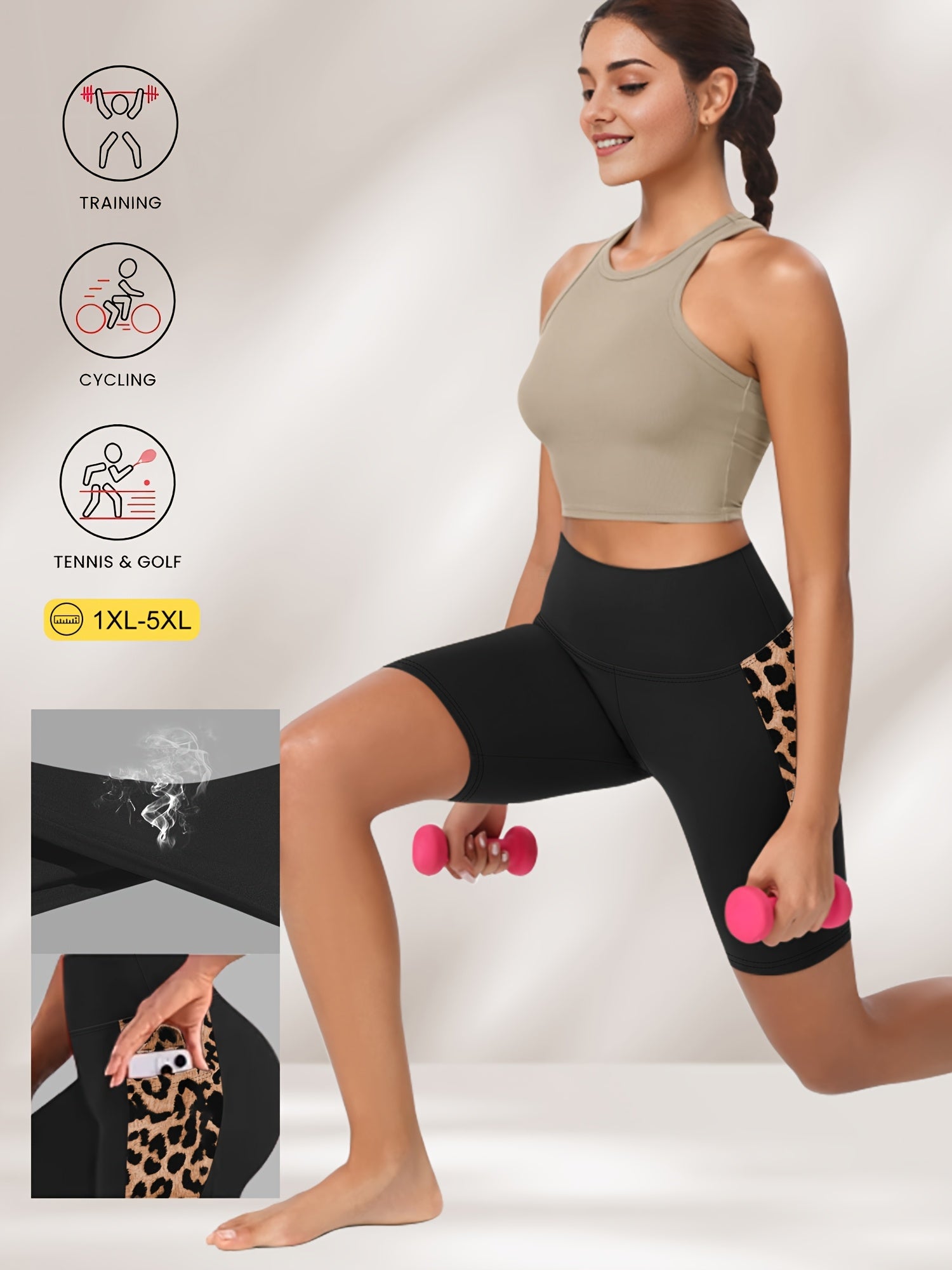 Women's Leopard Print High-Waist Tummy Control Shorts with Pockets