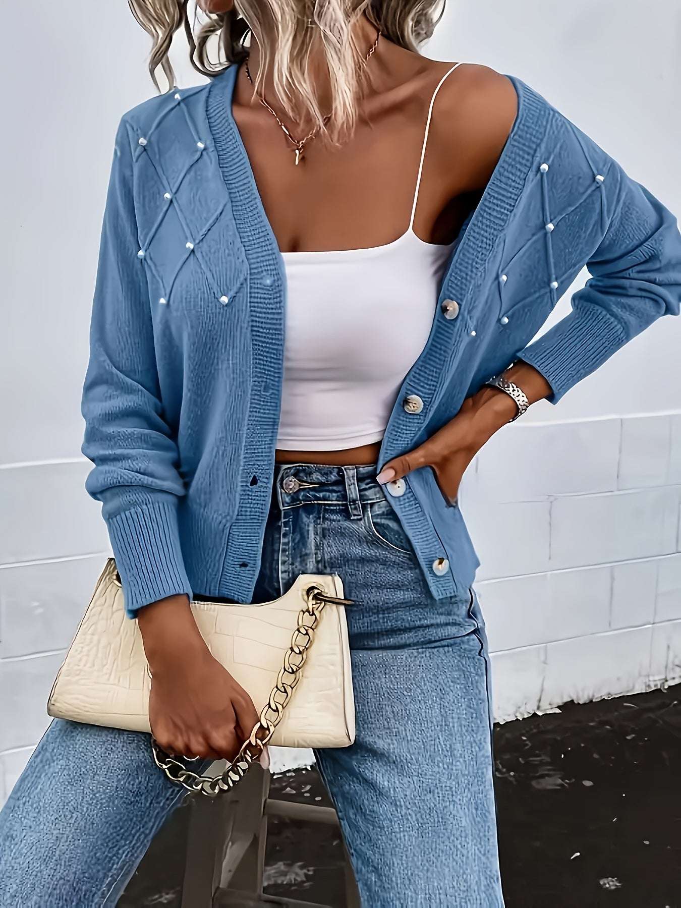 Women's Light Gray Pearl Embroidered Cardigan Long Sleeve Diamond Pattern