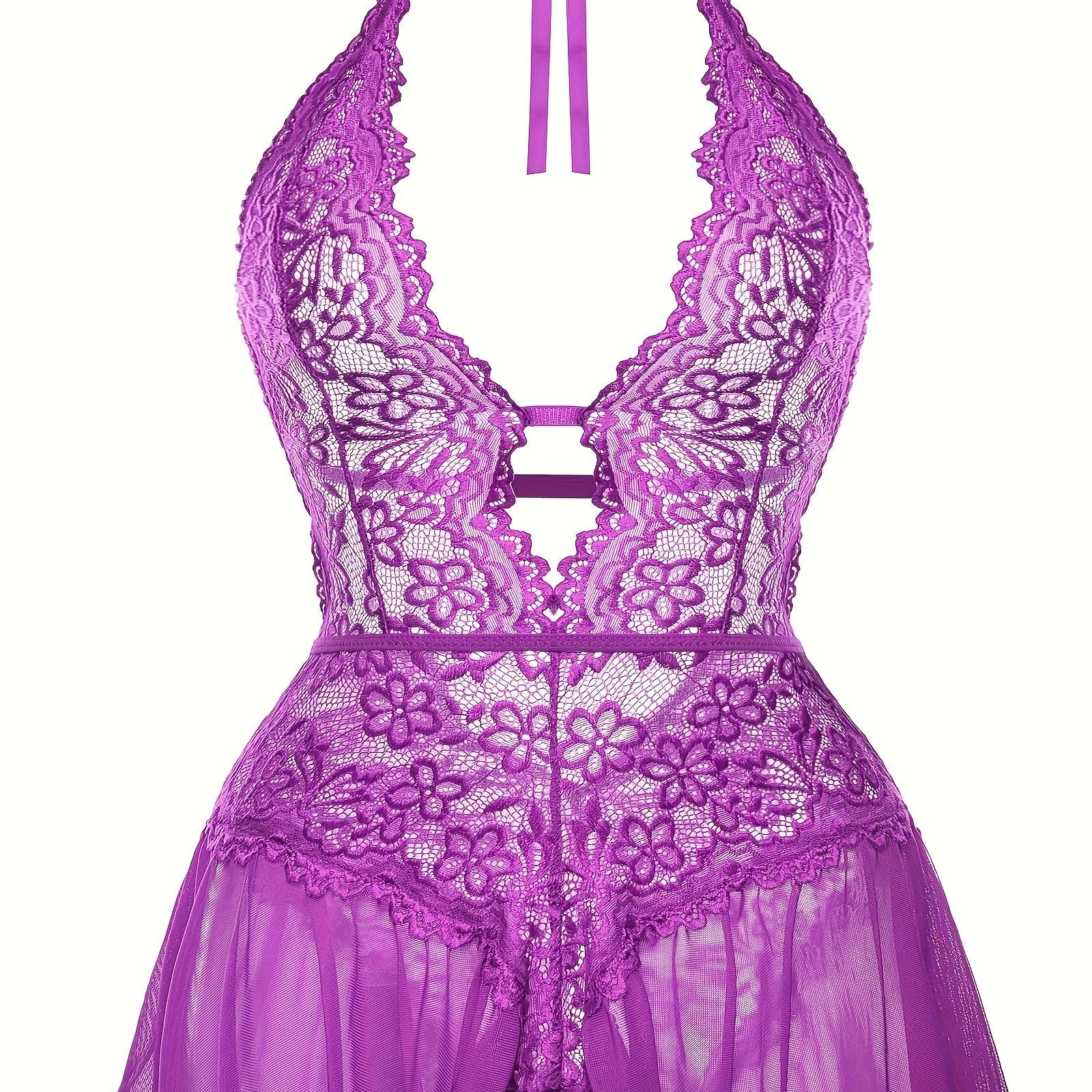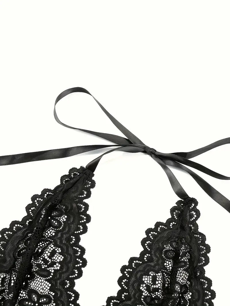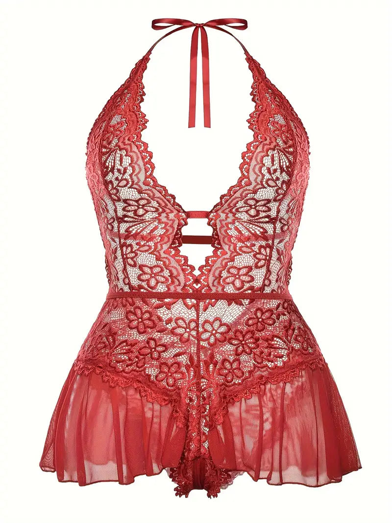 Women's Lingerie Bodysuit Floral Lace Plus Size Deep V Ruffle Halter