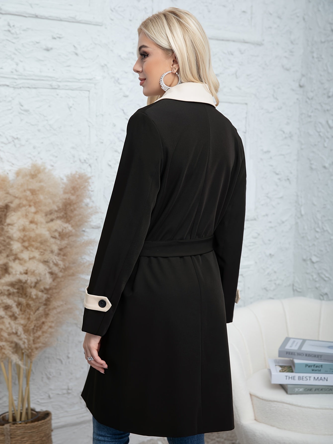 Women's Long Coat Autumn Winter Contrast Color Solid Pattern Woven Polyester Outerwear