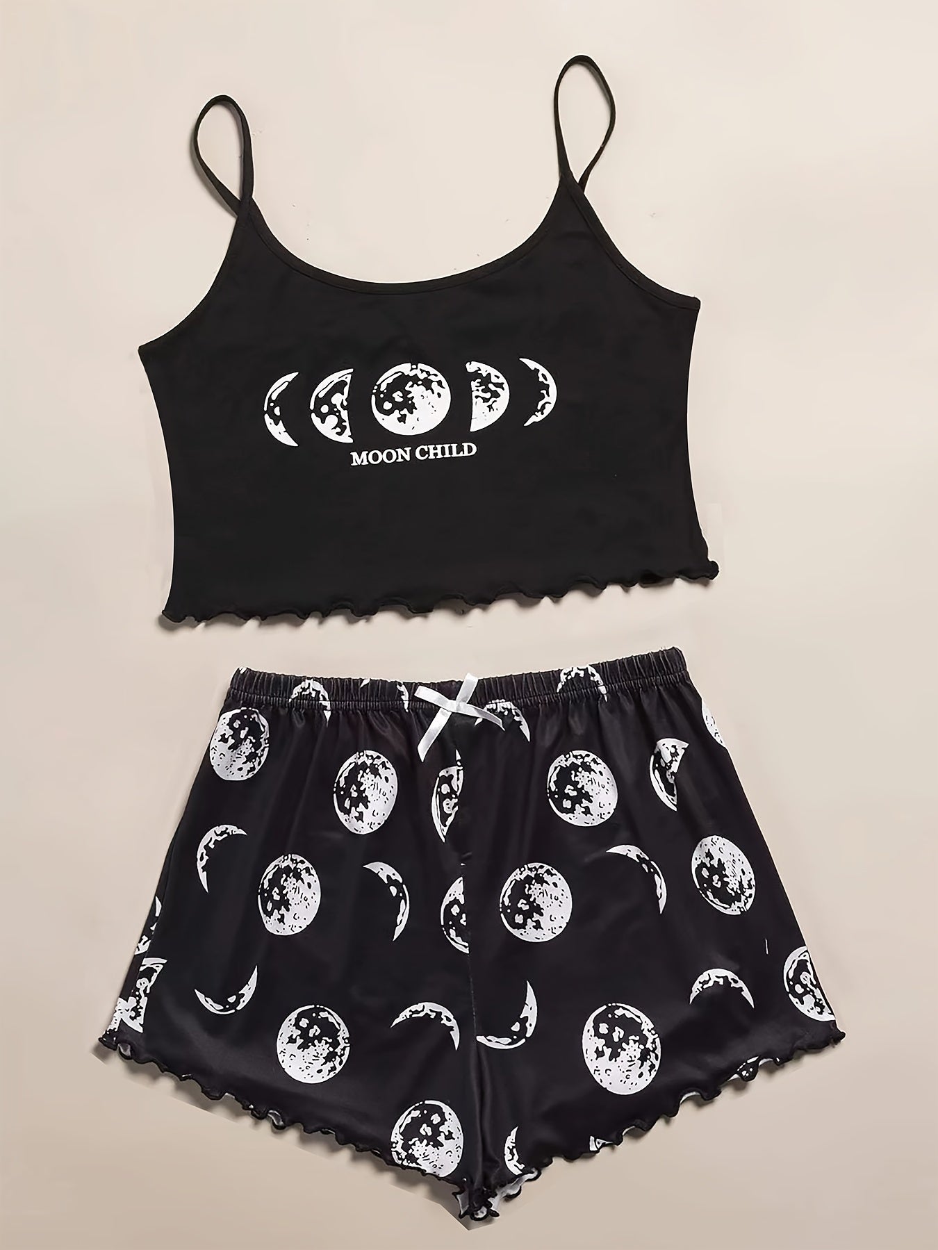 Women's Pajama Set with Moon and Galaxy Print Polyester Micro Elasticity Lettuce Trim Spaghetti Strap All Season