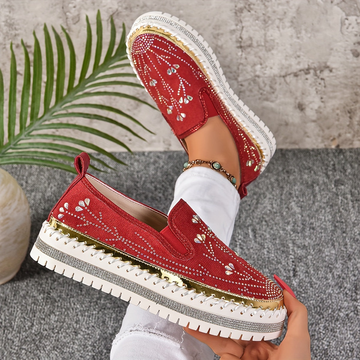 Women's Pink Glitter Slip-On Loafers with Rhinestones and Thick Sole