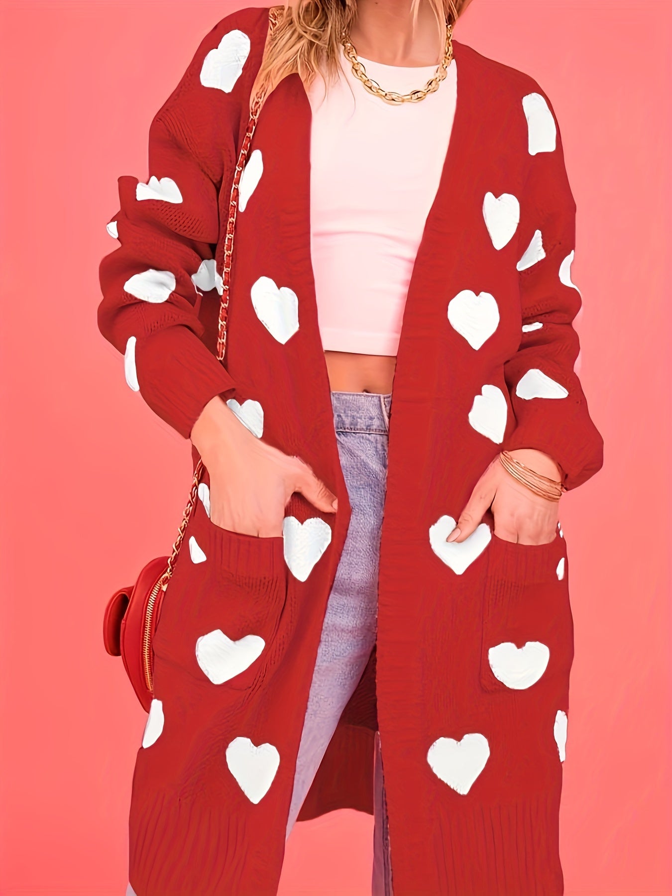 Women's Plus Size Red White Heart Pattern Cardigan Long Sleeve Open Front Sweater
