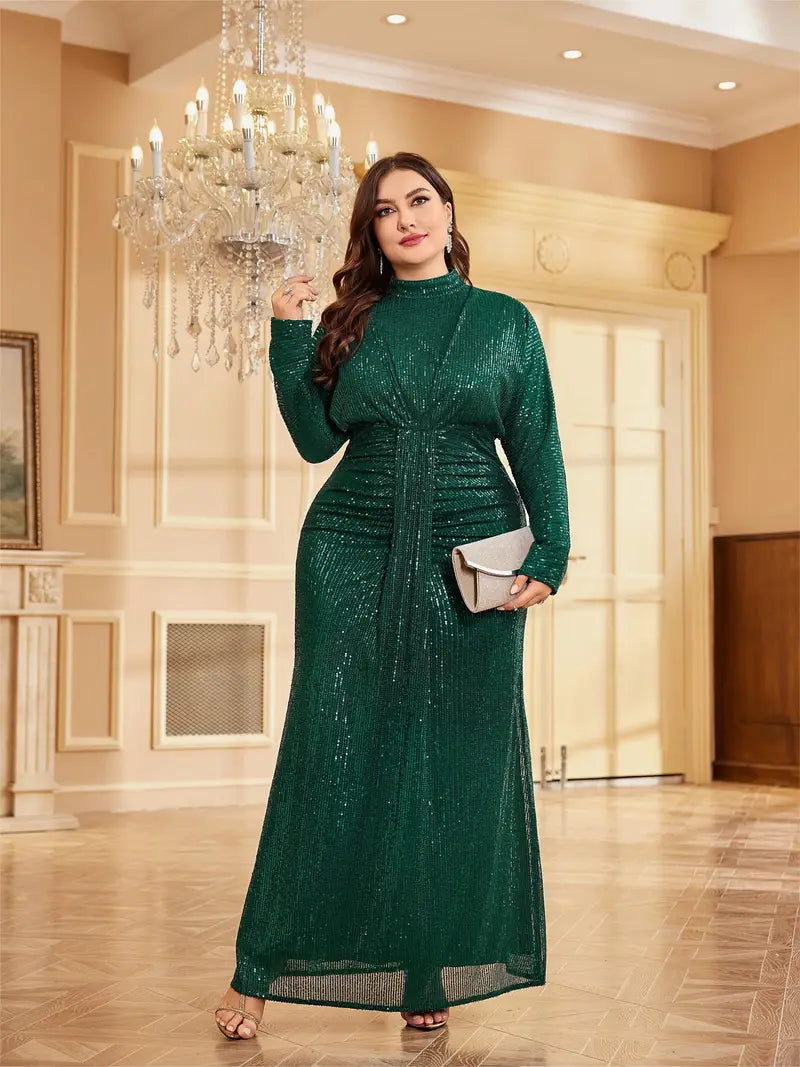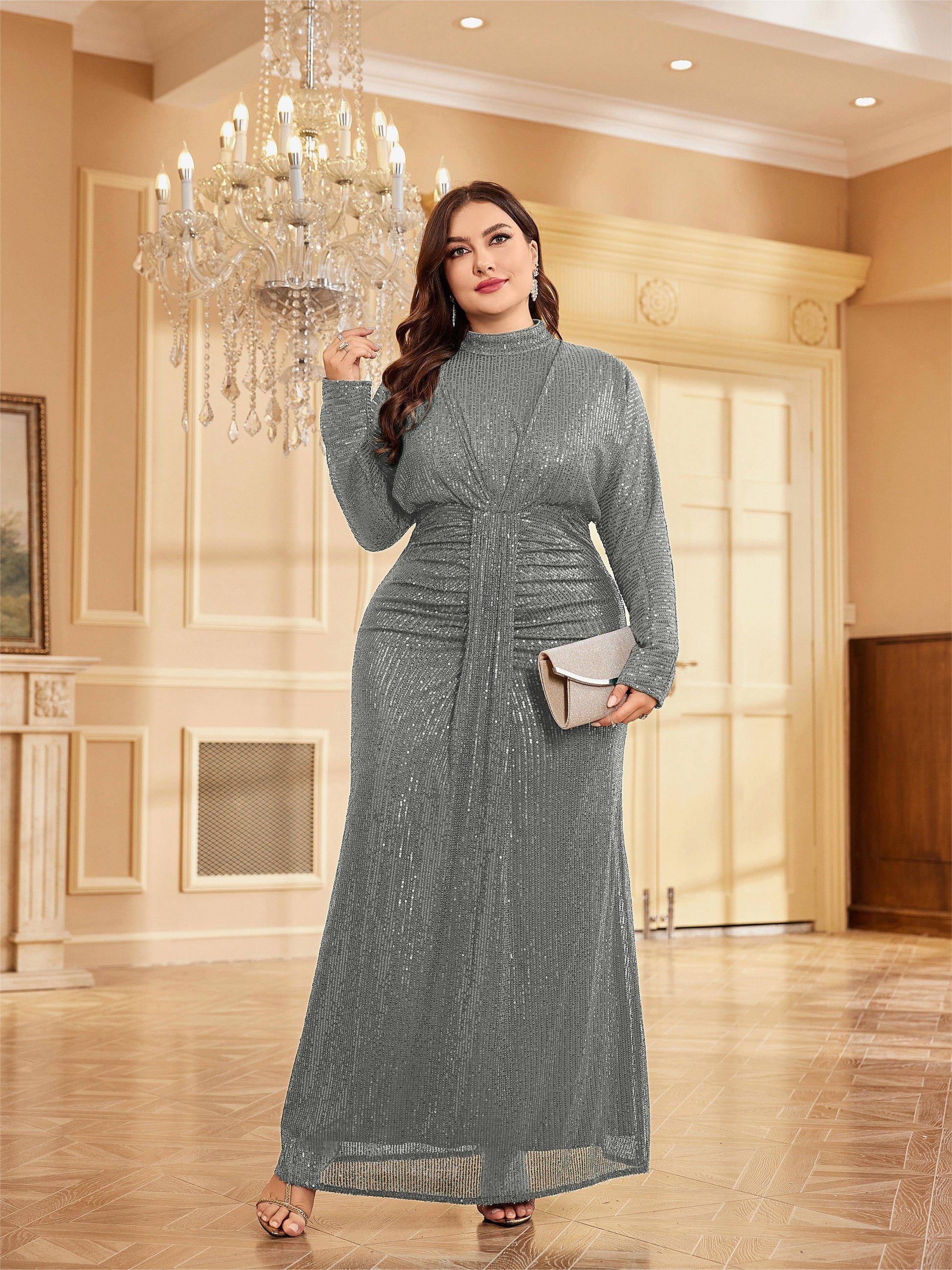 Women's Plus Size Sequined Cinched Waist Long Sleeve Dress for Party