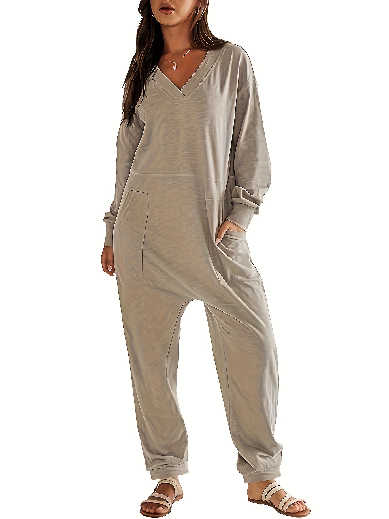 Women's Plus Size V-Neck Jumpsuit with Pockets and Stretch Fabric