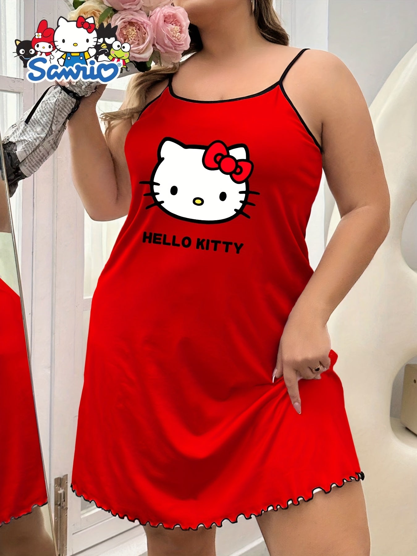 Women's Red Cartoon Print Sleep Dress, Ruffled Hem, Plus Size Nightgown