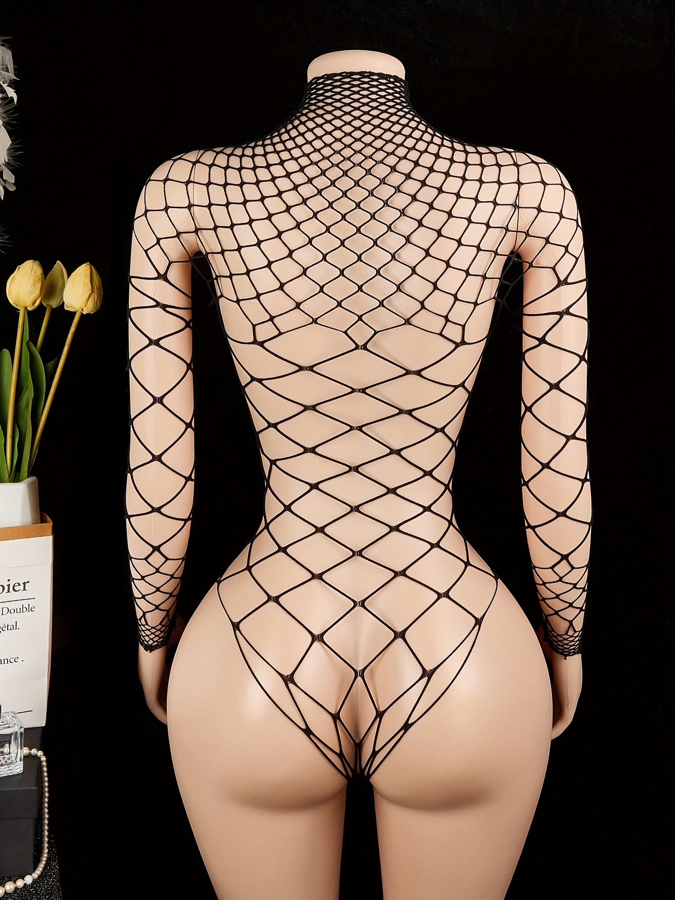 Women's Mesh Fishnet Bodysuit with Hollow-Out Design and Non-Transparent Polyamide Elastane
