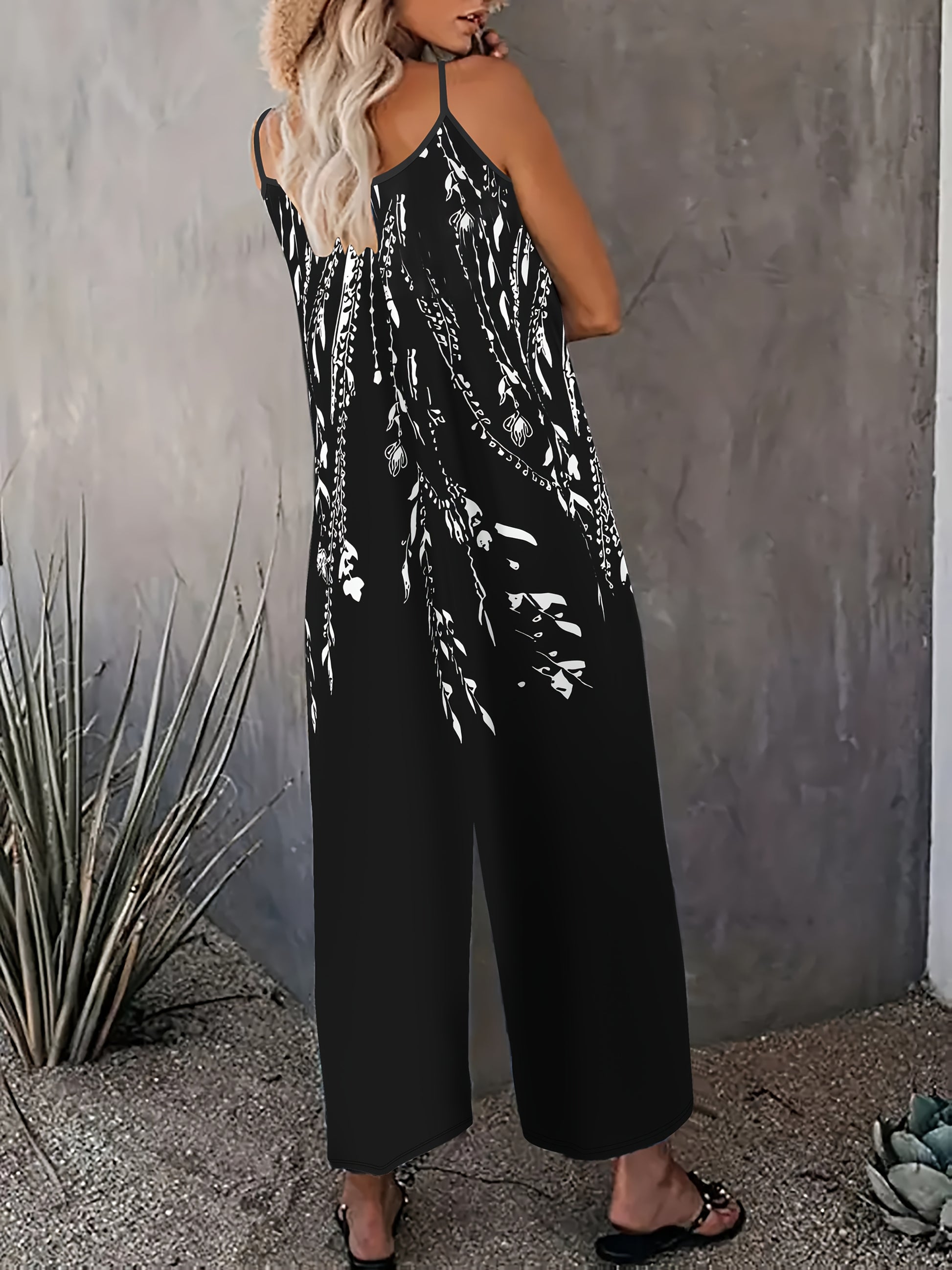 Women's Sleeveless Geometric Print Jumpsuit with Pockets and Spaghetti Straps