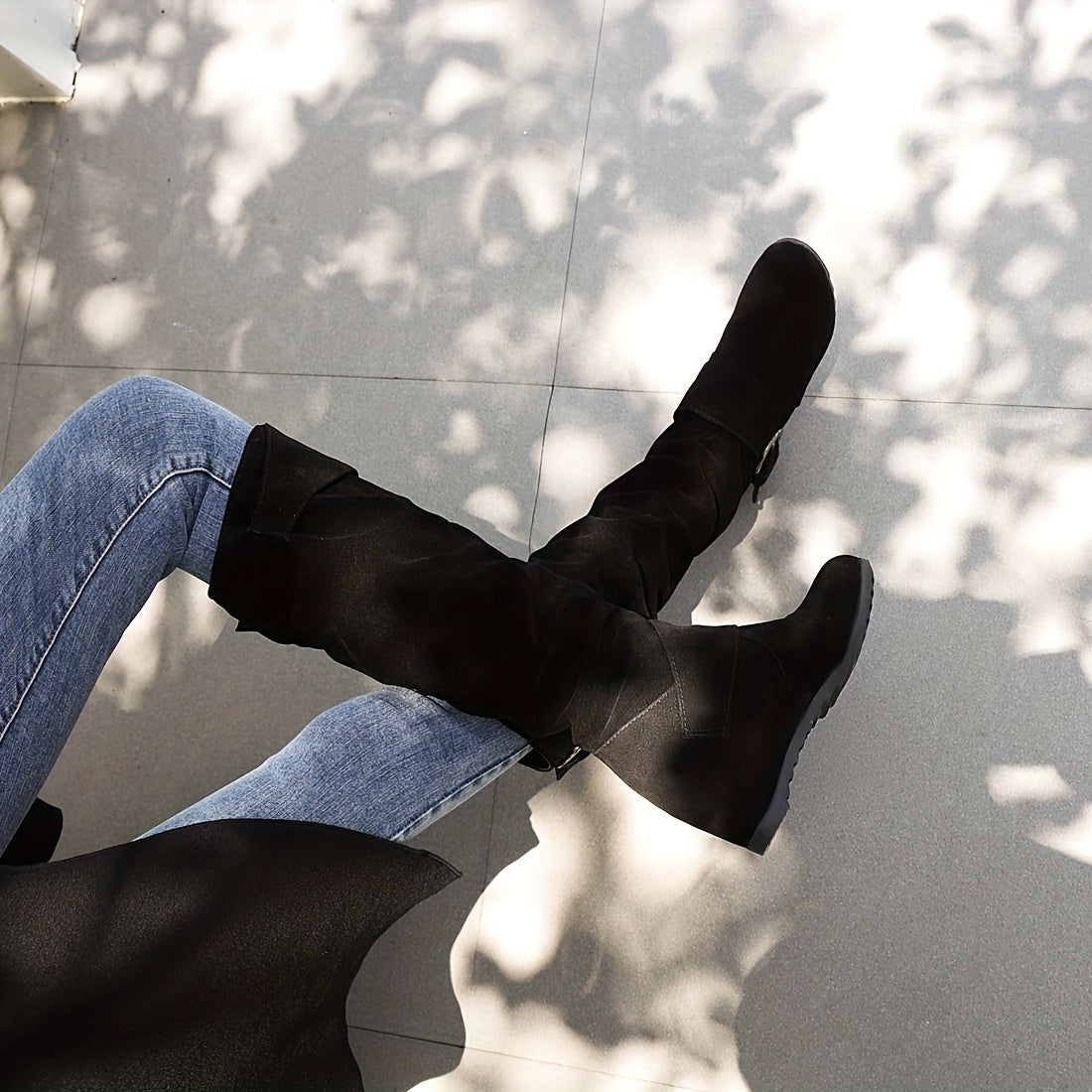 Women's Slouchy Fabric Mid-Calf Boots Round Toe Chunky Heel Beige Brown